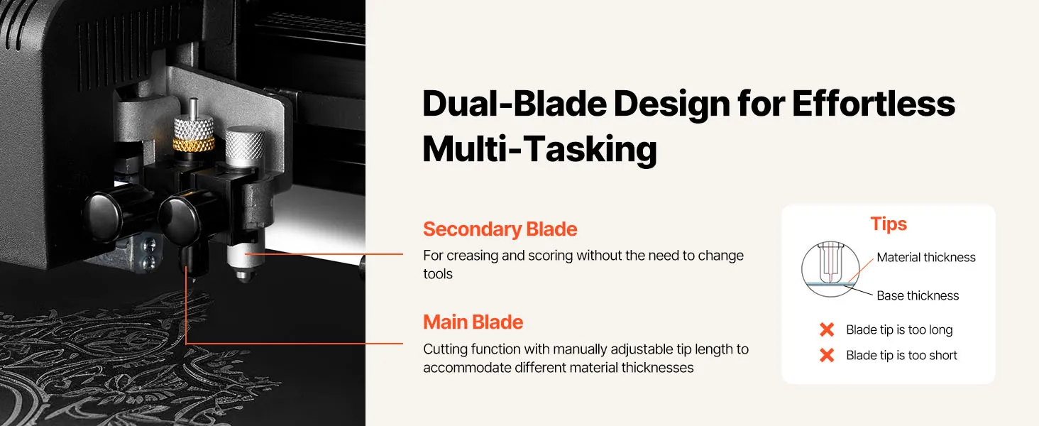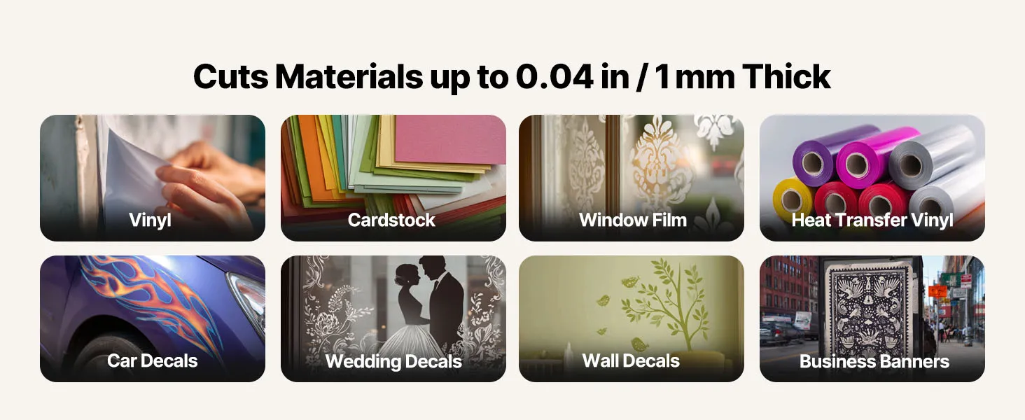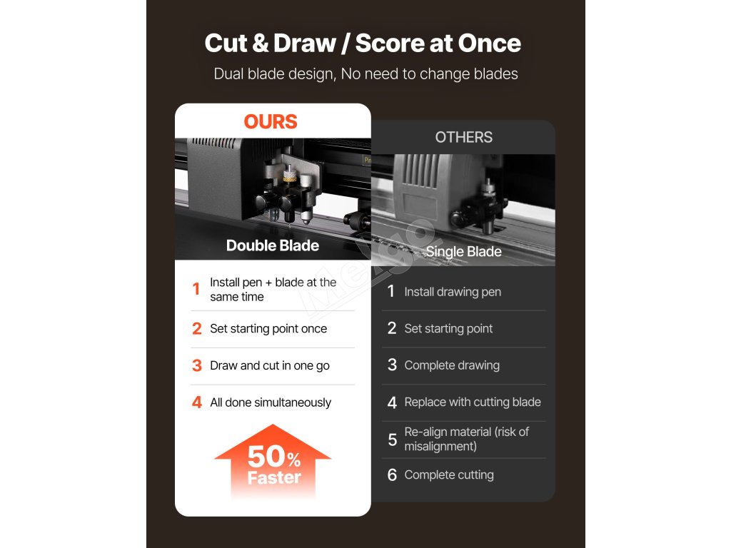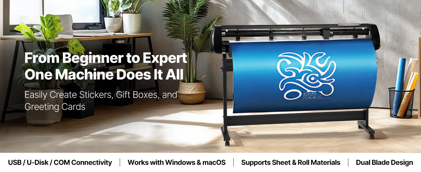 Tento stroj na rezanie vinylu má konštrukciu s dvoma čepeľami na vykresľovanie a rezanie/škrtanie bez výmeny čepelí. Je kompatibilný so systémami Windows a Mac. Reže fólie alebo rolky s hrúbkou až 1 mm s nastaviteľnou silou. presnosť ±0,1 mm a detekcia obrysov zabezpečujú stabilné, detailné rezy - jednoduché pre začiatočníkov.