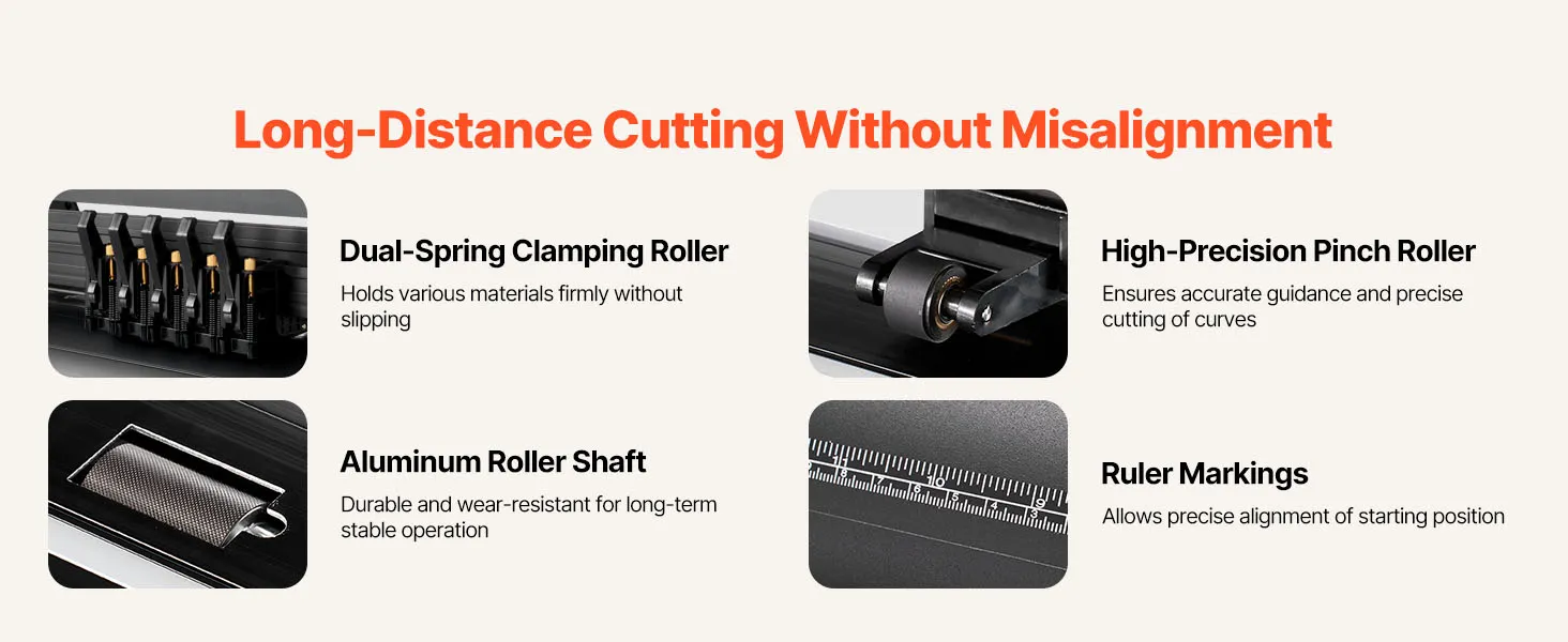 Náš stroj na rezanie vinylu používa hladké podávacie valce na papier, ktoré manipulujú s hárkami aj kotúčmi, čím zabezpečujú konzistentný a spoľahlivý výstup.