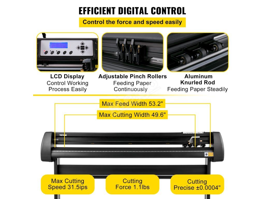 LCD displej a digitálny ovládací panel nastavujú silu a rýchlosť rezania, aby sa dosiahlo presnejšie a kontrolovanejšie rezanie v našom stroji na rezanie vinylu. Rezná sila sa dá dosiahnuť za 1,1 libry. Tri nastaviteľné dvojpružinové valčeky zabezpečujú, že plotrový rezací stroj dosahuje šírku podávania 53,2 palca a rýchlosť rezania 31,5ips.