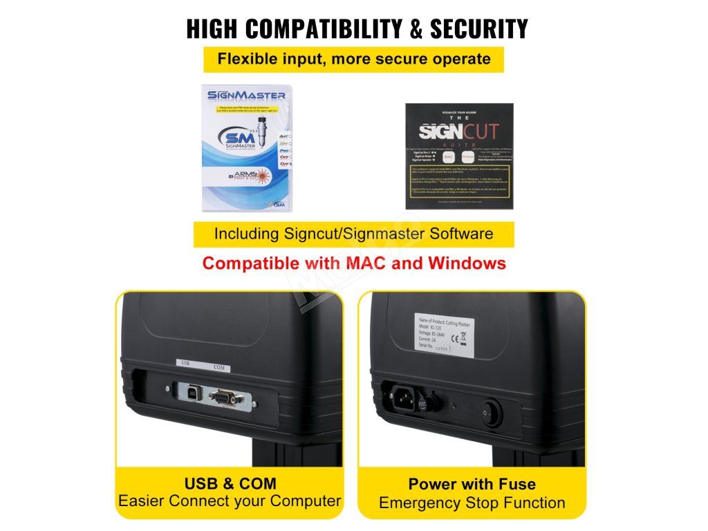 Tento výrobok je vybavený softvérom signcut a signmaster prostredníctvom duálneho rozhrania, takže má vysokú kompatibilitu a flexibilný vstup (softvér signcut musíte po roku obnoviť). Okrem toho napájanie s poistkou môže znížiť pravdepodobnosť vášho zranenia.