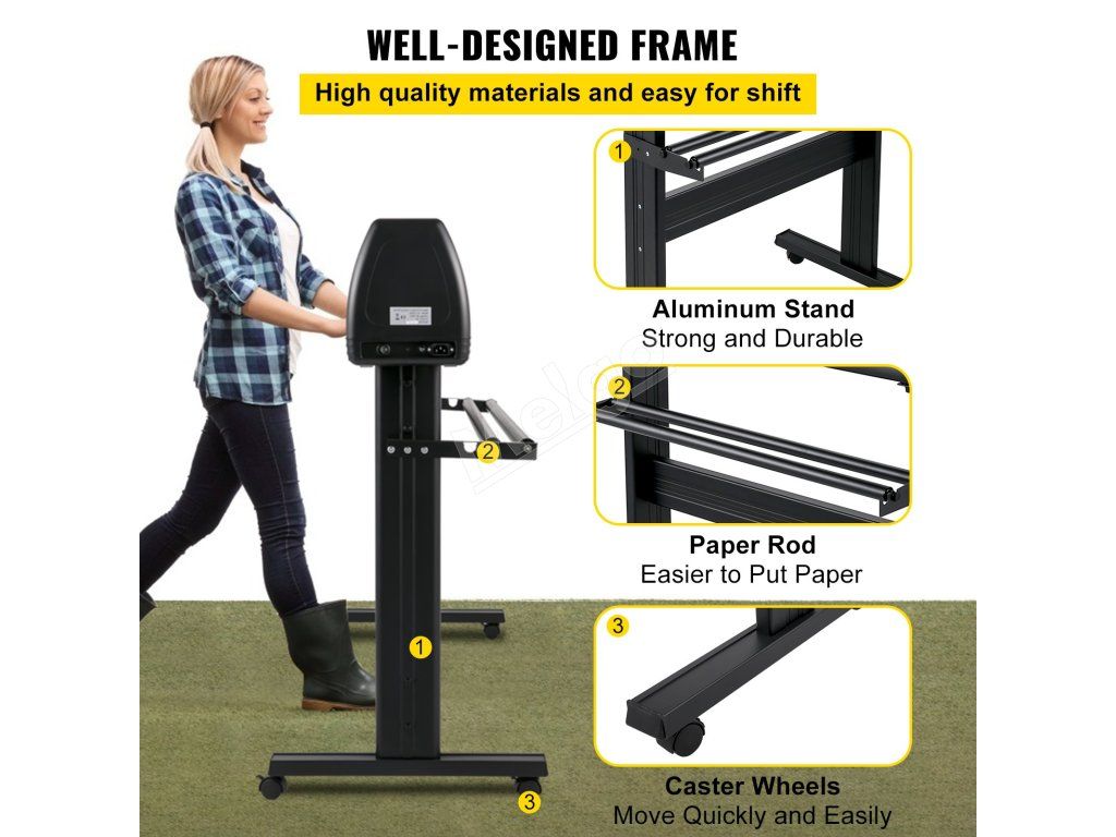 Ploter na rezanie vinylu so stojanom má kompaktné rozmery, ale robustný rám z hliníkovej zliatiny. Tyč na papier a kolieska vám tak pomôžu pracovať ľahko a efektívne.