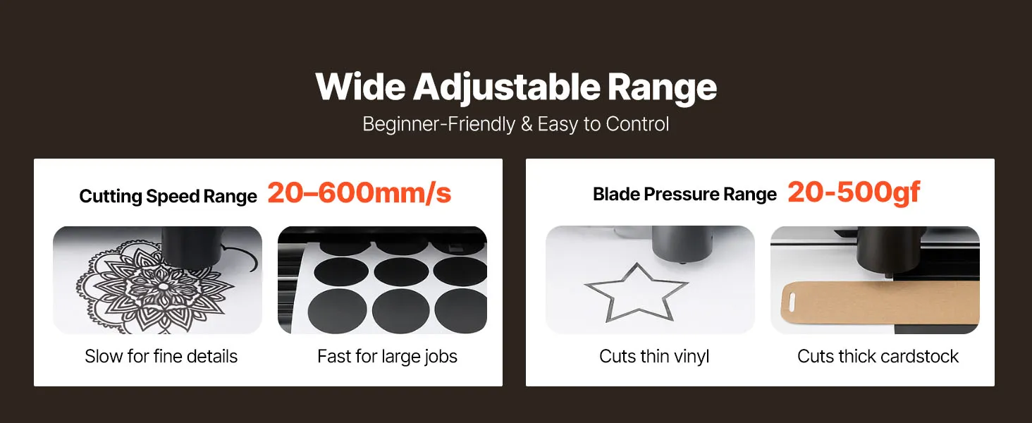 Tento stroj na rezanie vinylu má konštrukciu s dvoma čepeľami na vykresľovanie a rezanie/škrtanie bez výmeny čepelí. Je kompatibilný so systémami Windows a Mac. Reže fólie alebo rolky s hrúbkou až 1 mm s nastaviteľnou silou. presnosť ±0,1 mm a detekcia obrysov zabezpečujú stabilné, detailné rezy - jednoduché pre začiatočníkov.