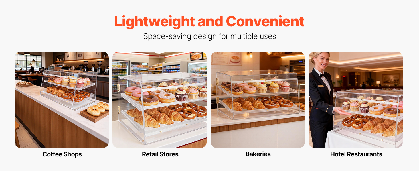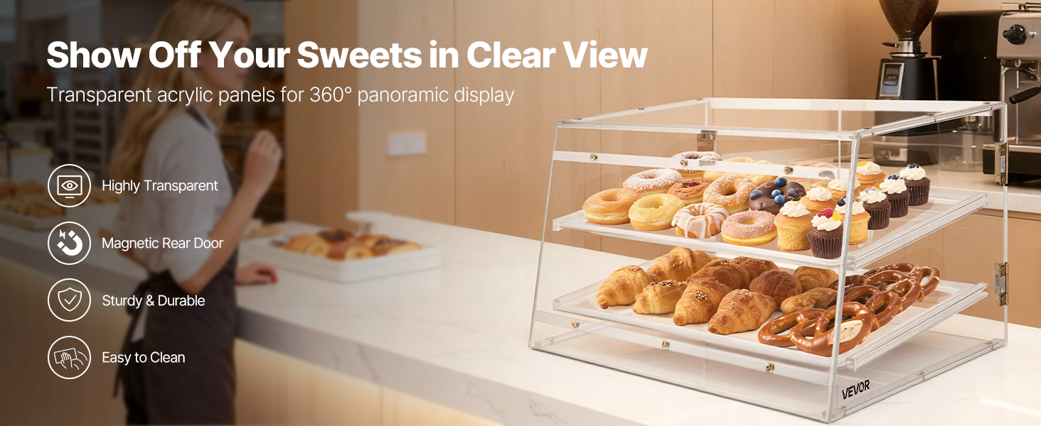 Táto akrylová vitrína na pečivo je navrhnutá tak, aby pekárske výrobky krásne prezentovala na pultoch a poskytovala jasný, úplný pohľad, ktorý láka zákazníkov. Ľahká, ale pevná priehľadná akrylová konštrukcia zvýrazňuje vaše pečivo a zároveň zaisťuje stabilitu, odolnosť a ľahkú prenosnosť.