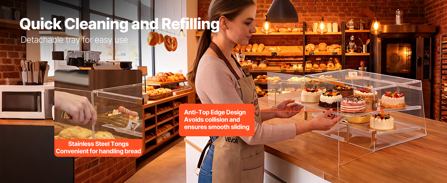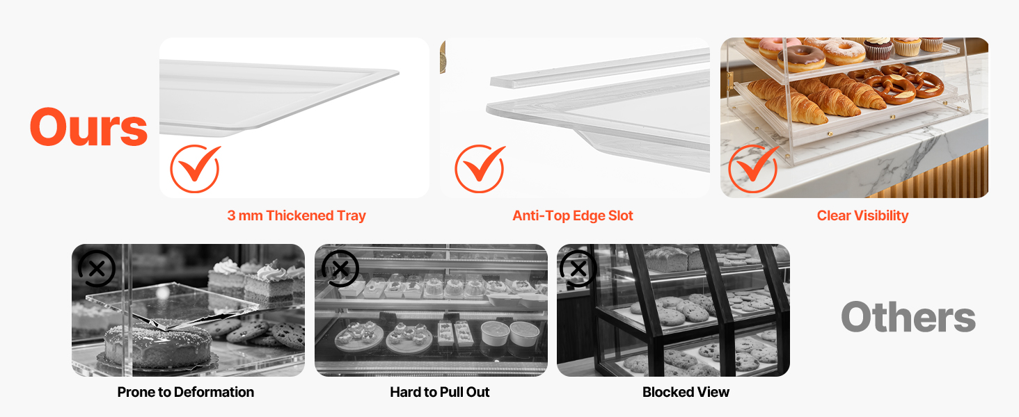 Táto vitrína na dezerty využíva zosilnené police pre extra pevnosť a odolnosť. Je vyrobená z vysoko kvalitného akrylu s vysokou priehľadnosťou a poskytuje krištáľovo čistý 360° pohľad na vaše pečivo. Vylepšený systém dvierok zaisťuje pohodlné dopĺňanie zásob a jednoduché čistenie pri zachovaní bezchybného vzhľadu vitríny.