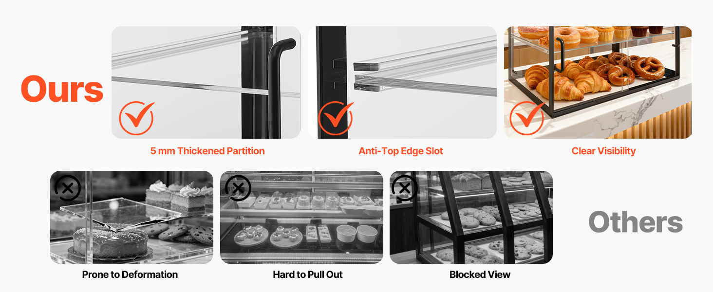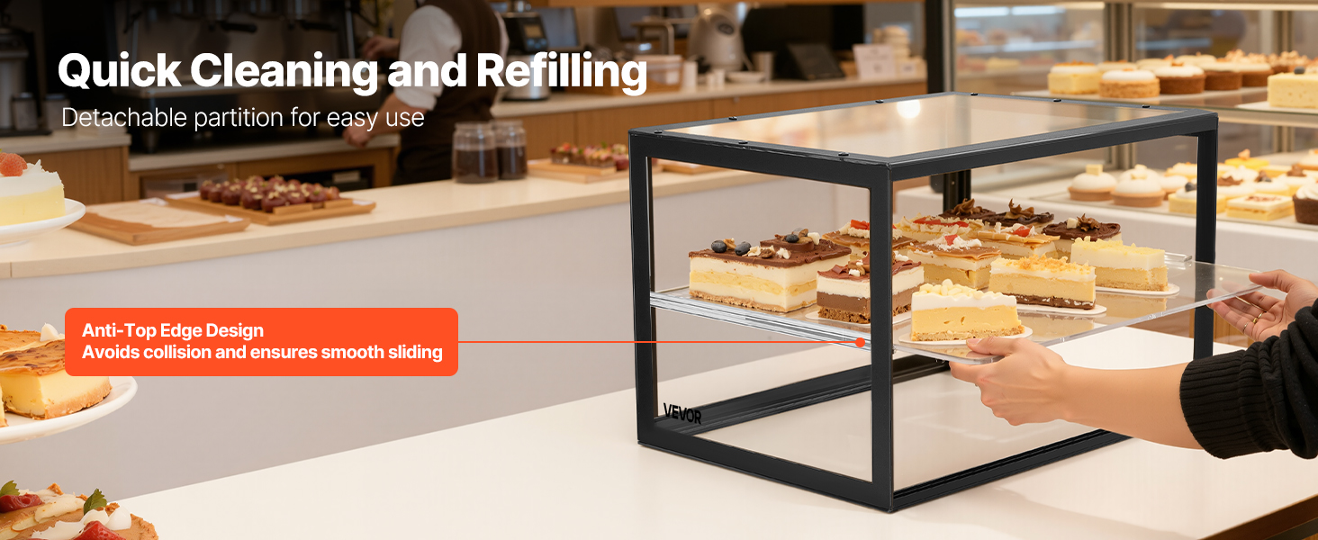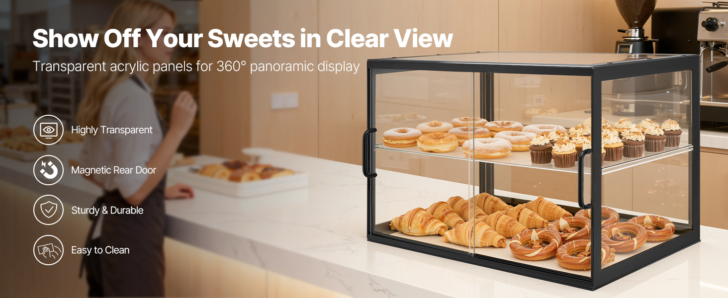 Táto vitrína na dezerty používa zosilnenú policu pre extra pevnosť a odolnosť. Je vyrobená z vysoko kvalitného akrylu s vysokou priehľadnosťou a poskytuje krištáľovo čistý 360° pohľad na vaše pečivo. Vylepšený systém dvierok zaisťuje pohodlné dopĺňanie zásob a jednoduché čistenie pri zachovaní bezchybného vzhľadu.