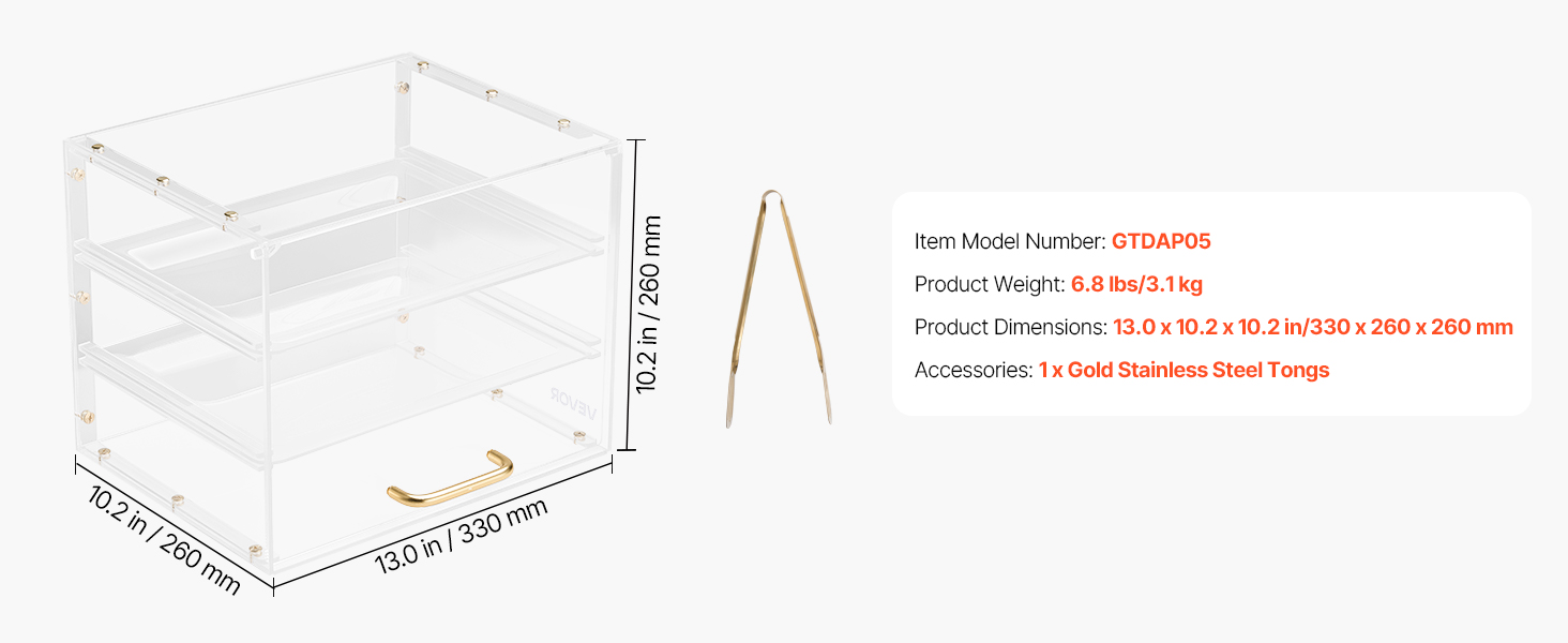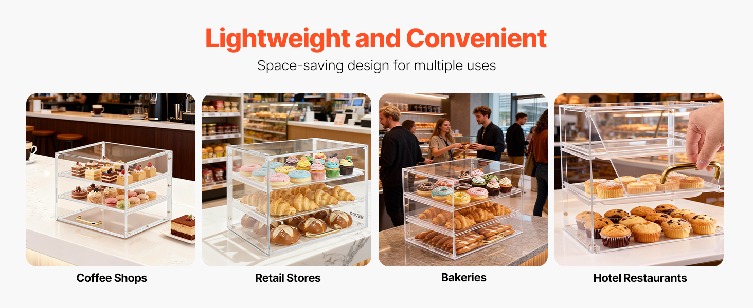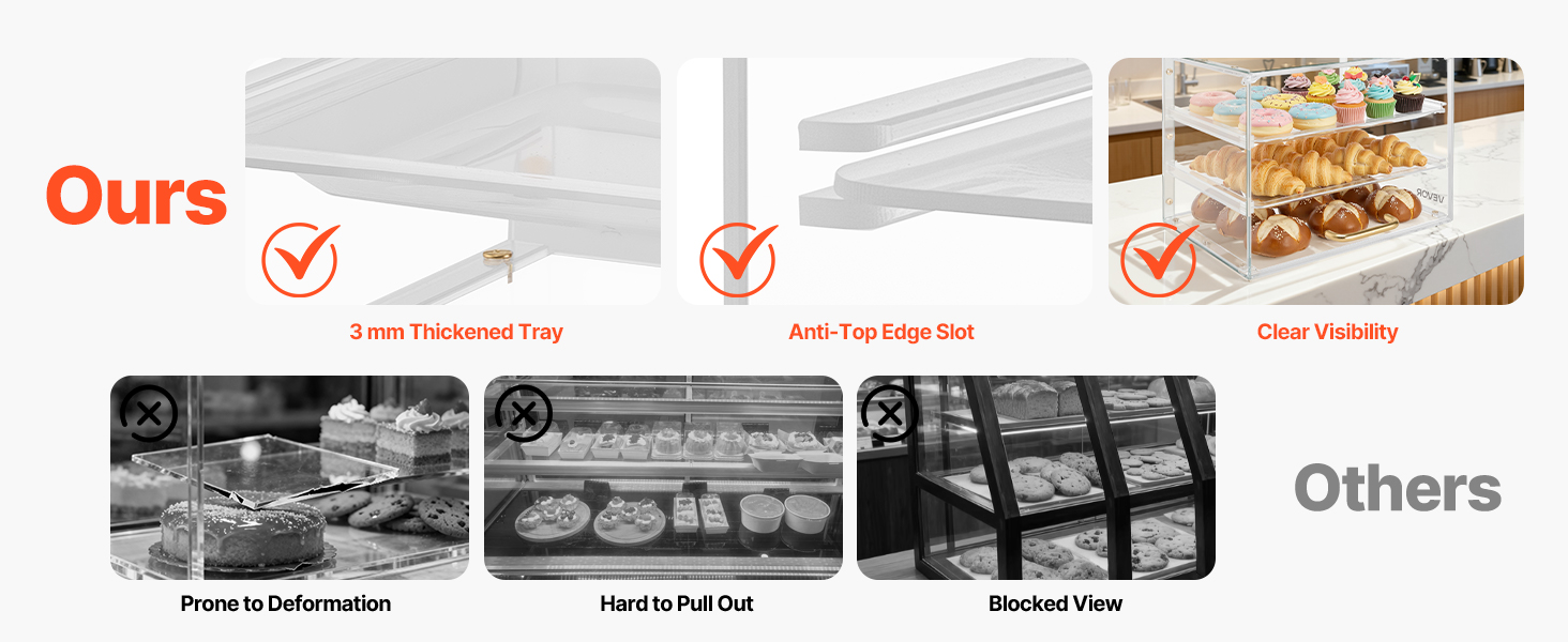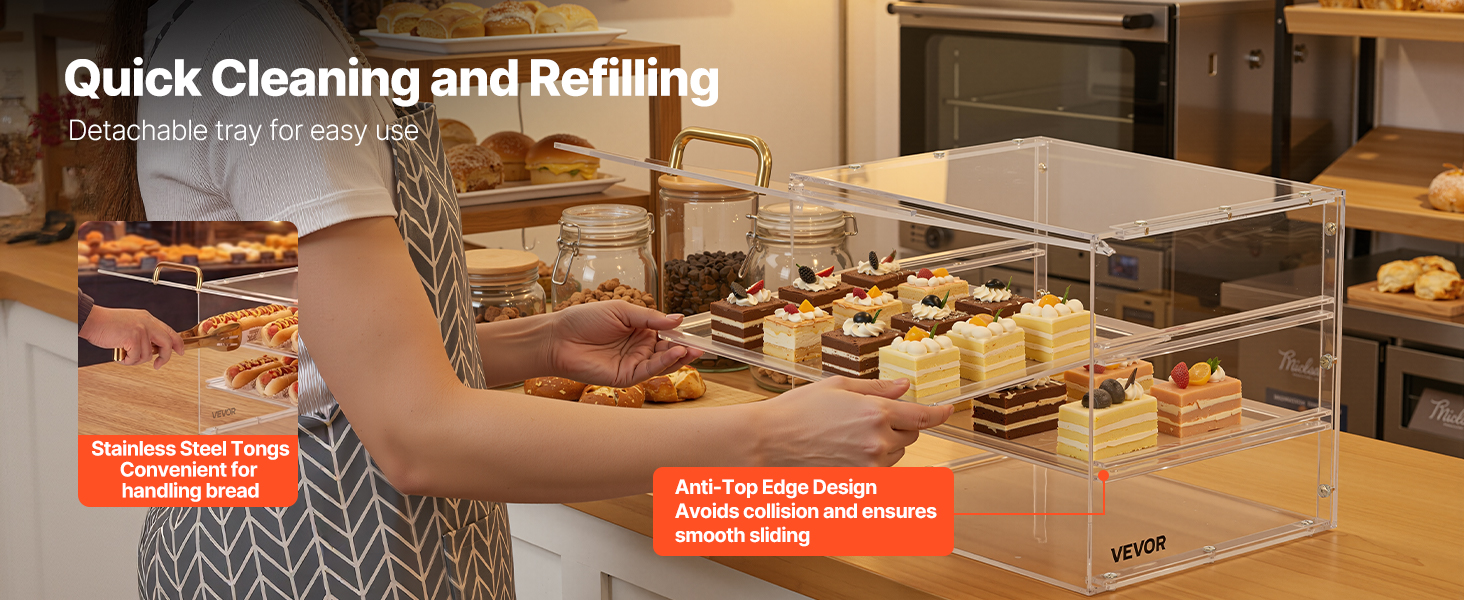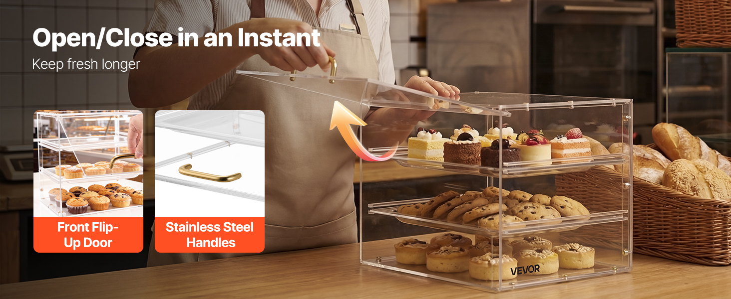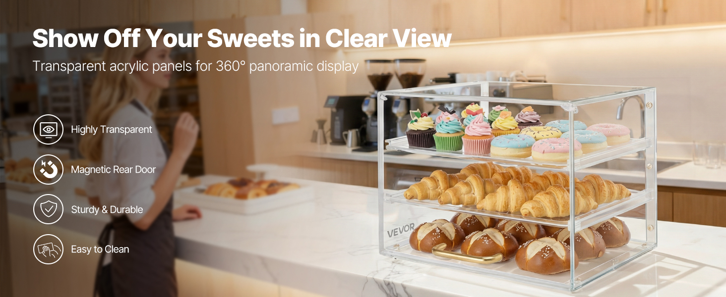 Táto vitrína na dezerty používa zosilnené police pre extra pevnosť a odolnosť. Je vyrobená z vysoko kvalitného akrylu s vysokou priehľadnosťou a poskytuje krištáľovo čistý 360° pohľad na vaše pečivo. Vylepšený systém dvierok zaisťuje pohodlné dopĺňanie zásob a ľahké čistenie pri zachovaní bezchybného vzhľadu.