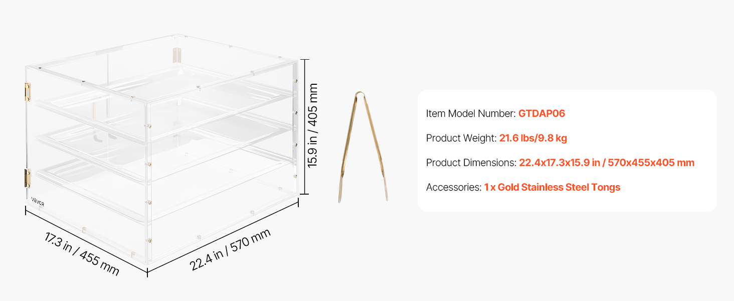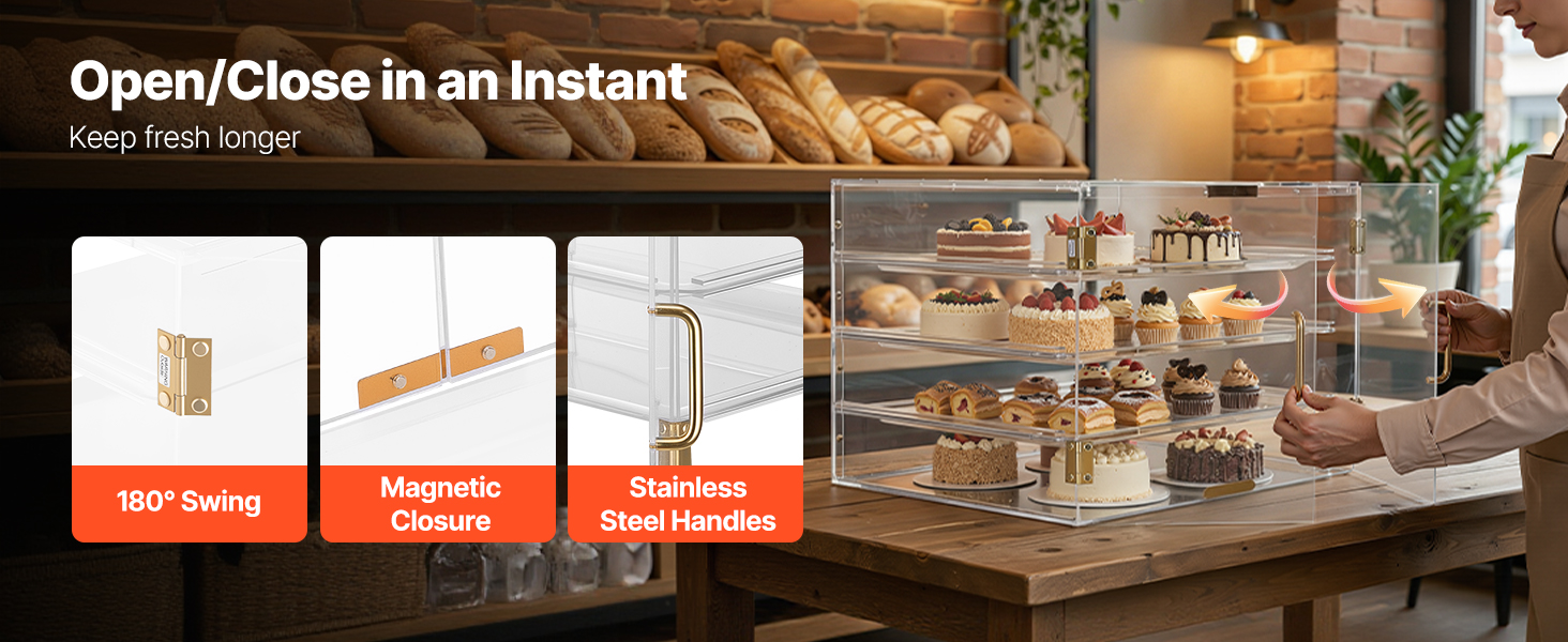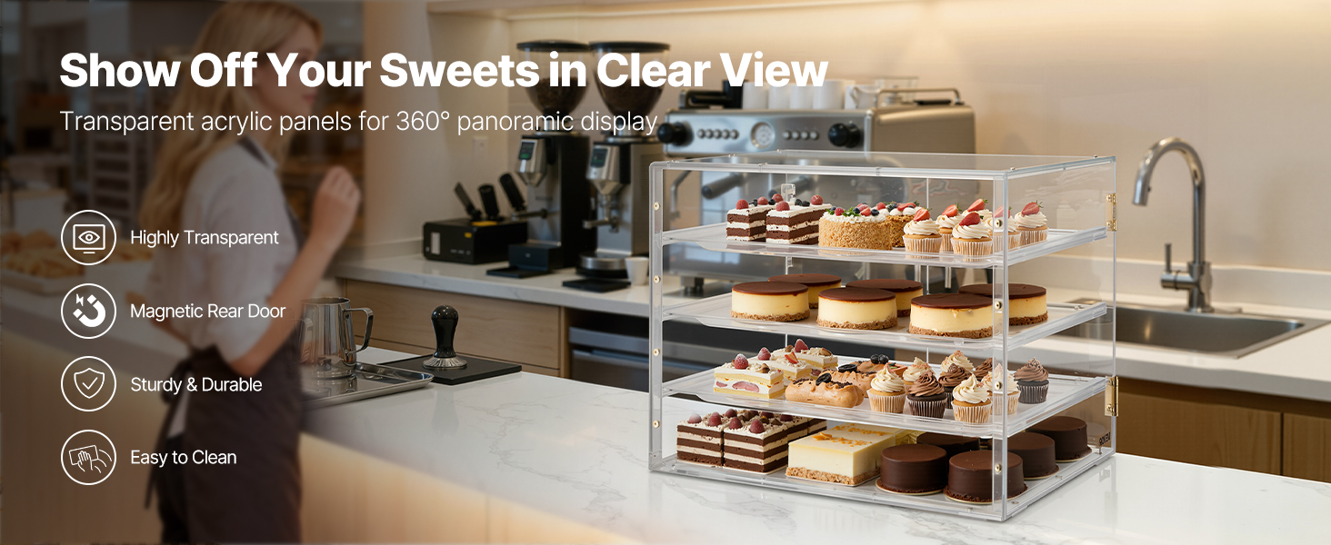 Táto vitrína na dezerty využíva zosilnené police pre extra pevnosť a odolnosť. Je vyrobená z vysoko transparentného akrylu a poskytuje krištáľovo čistý 360° pohľad na vaše pečivo. Vylepšený systém dvierok zaisťuje pohodlné dopĺňanie zásob a jednoduché čistenie pri zachovaní bezchybného vzhľadu.