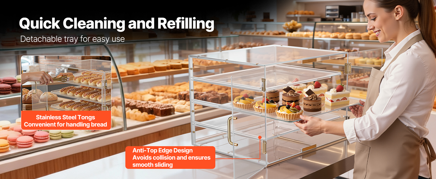 Naša pekárenská vitrína obsahuje odnímateľné podnosy pre jednoduché doplňovanie zásob. Unikátny dizajn drážok proti okrajom umožňuje podnosom hladko sa zasúvať bez nárazu do predného panelu, čím sa chráni vitrína a predlžuje sa jej životnosť pre dlhodobé komerčné použitie.