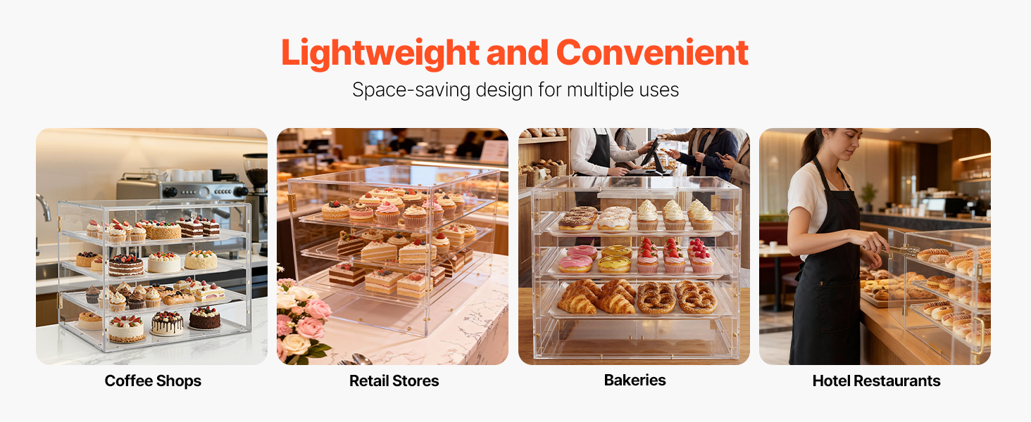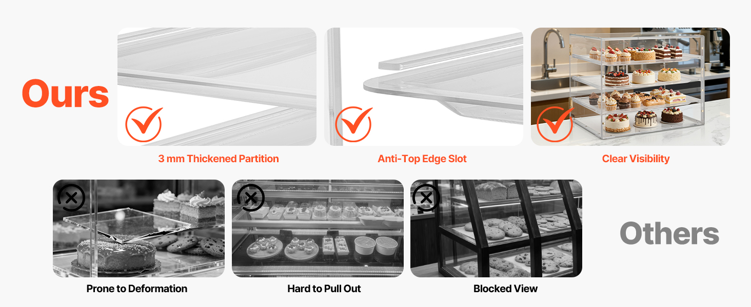 Táto akrylová vitrína na pečivo je navrhnutá tak, aby pekárske výrobky krásne prezentovala na pultoch a poskytovala jasný, úplný pohľad, ktorý láka zákazníkov. Ľahká, ale pevná priehľadná akrylová konštrukcia zvýrazňuje vaše pečivo a zároveň zaisťuje stabilitu, odolnosť a ľahkú prenosnosť.