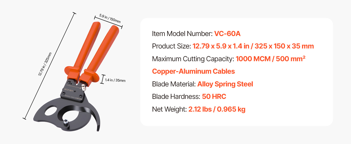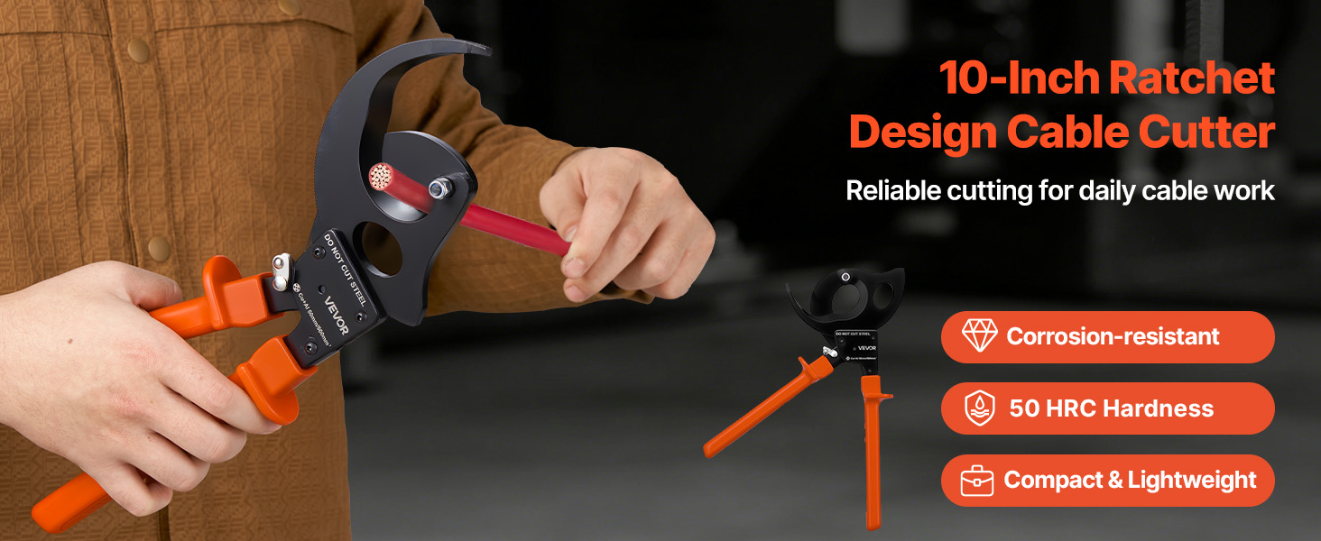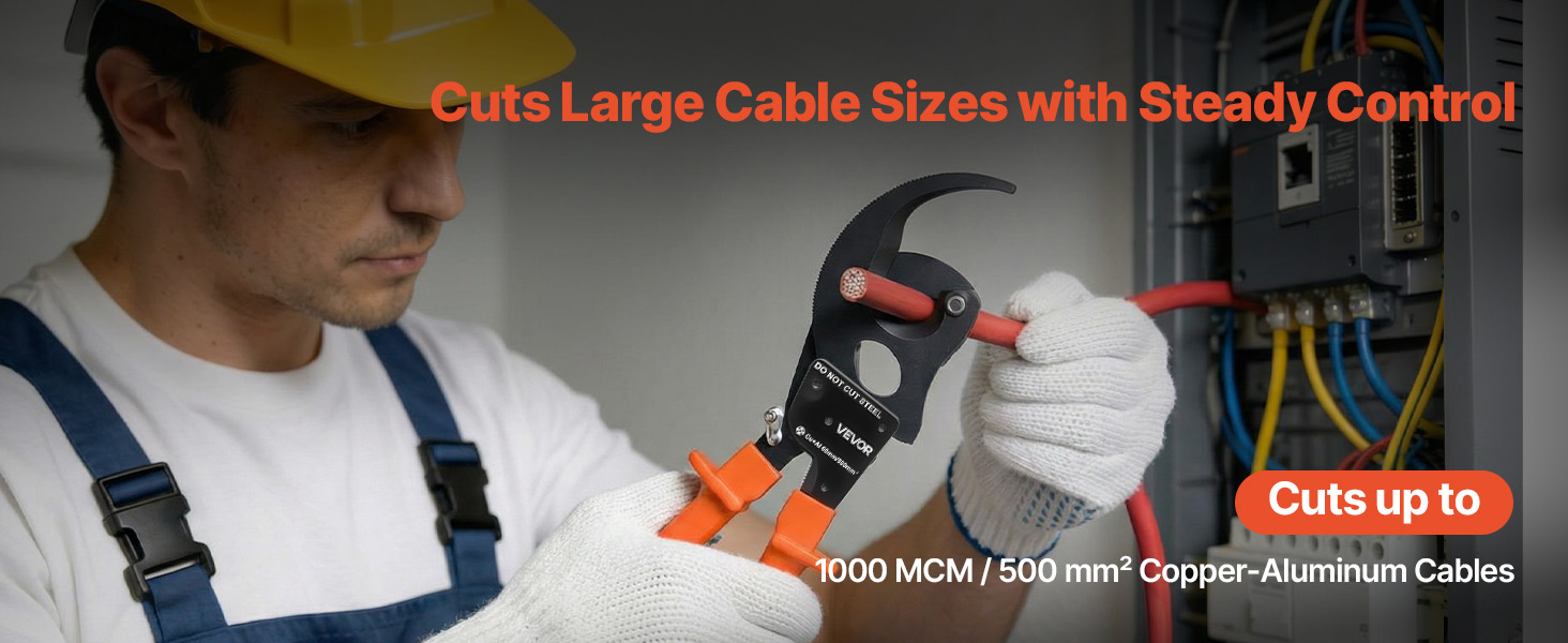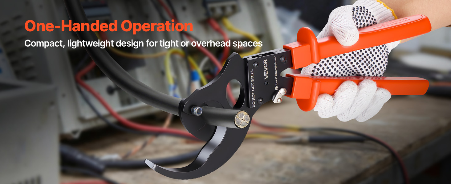 Tieto kliešte na káble s račňou sú vybavené račňovým mechanizmom pre postupné pôsobenie sily. Tento račňový mechanizmus pomáha udržiavať hladké rezanie pri práci s hrubšími medenými a hliníkovými káblami.