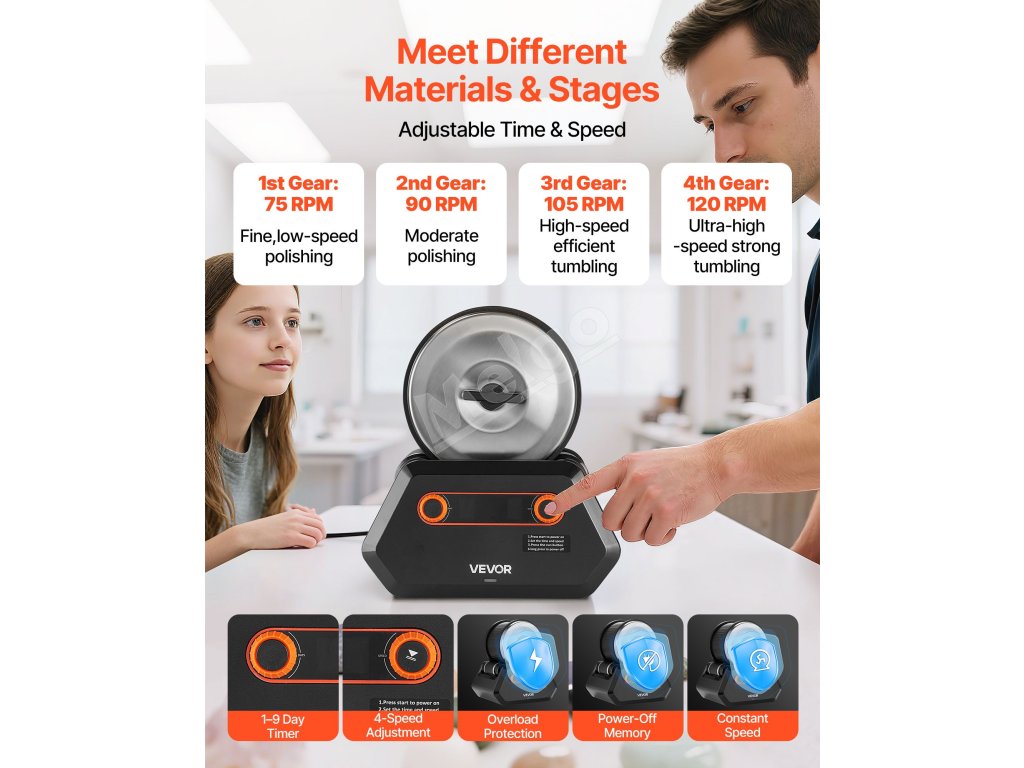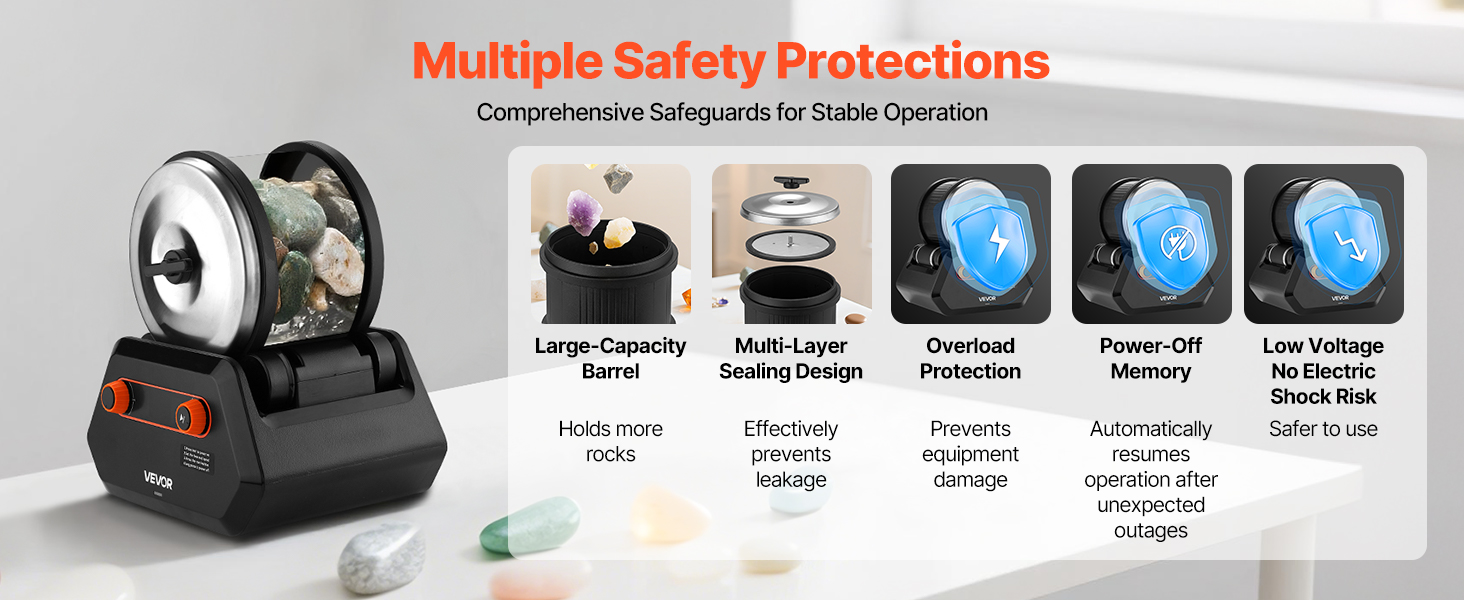Táto leštička kameňa je vybavená viacerými bezpečnostnými funkciami na isté používanie. Veľkokapacitný valec pojme viac kameňov pre vyššiu účinnosť, utesnená konštrukcia zabraňuje úniku, ochrana proti preťaženiu zabraňuje poškodeniu, pamäť na vypnutie obnoví činnosť po výpadku a nízkonapäťová konštrukcia odstraňuje riziko úrazu elektrickým prúdom.