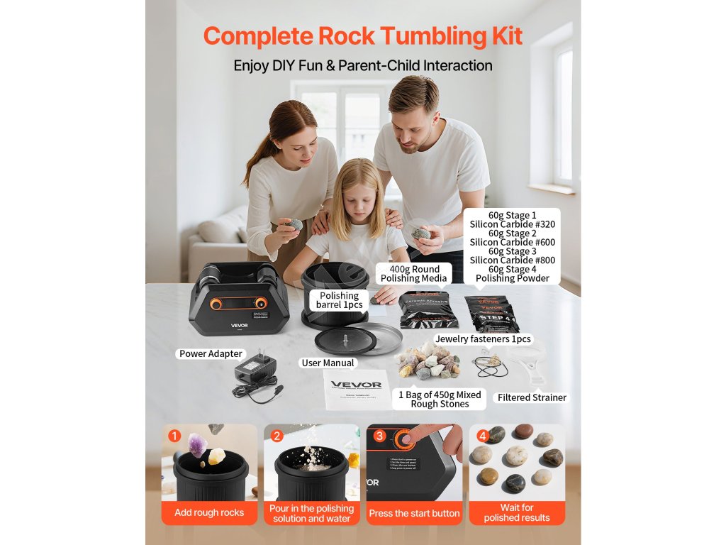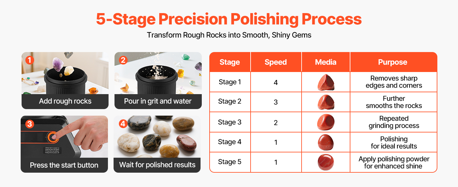 Táto súprava na leštenie kameňov využíva viacstupňový proces na premenu hrubých kameňov na hladké, jemné kúsky. Prevádzka je jednoduchá a efektívna, nevyžaduje žiadne zložité kroky na dosiahnutie rafinovaných výsledkov.