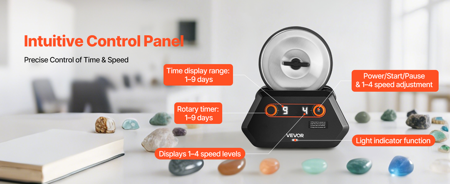 Naša leštička kameňa je vybavená intuitívnym ovládacím panelom na jednoduché ovládanie. Môžete si nastaviť čas chodu a upraviť úrovne rýchlosti podľa svojej ľubovôle, aby ste presne kontrolovali proces leštenia, čím zakaždým zabezpečíte optimálne výsledky.