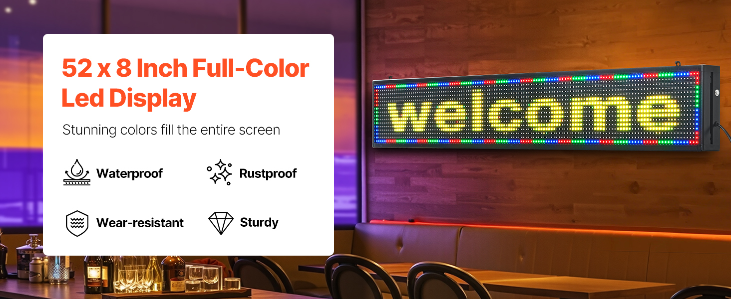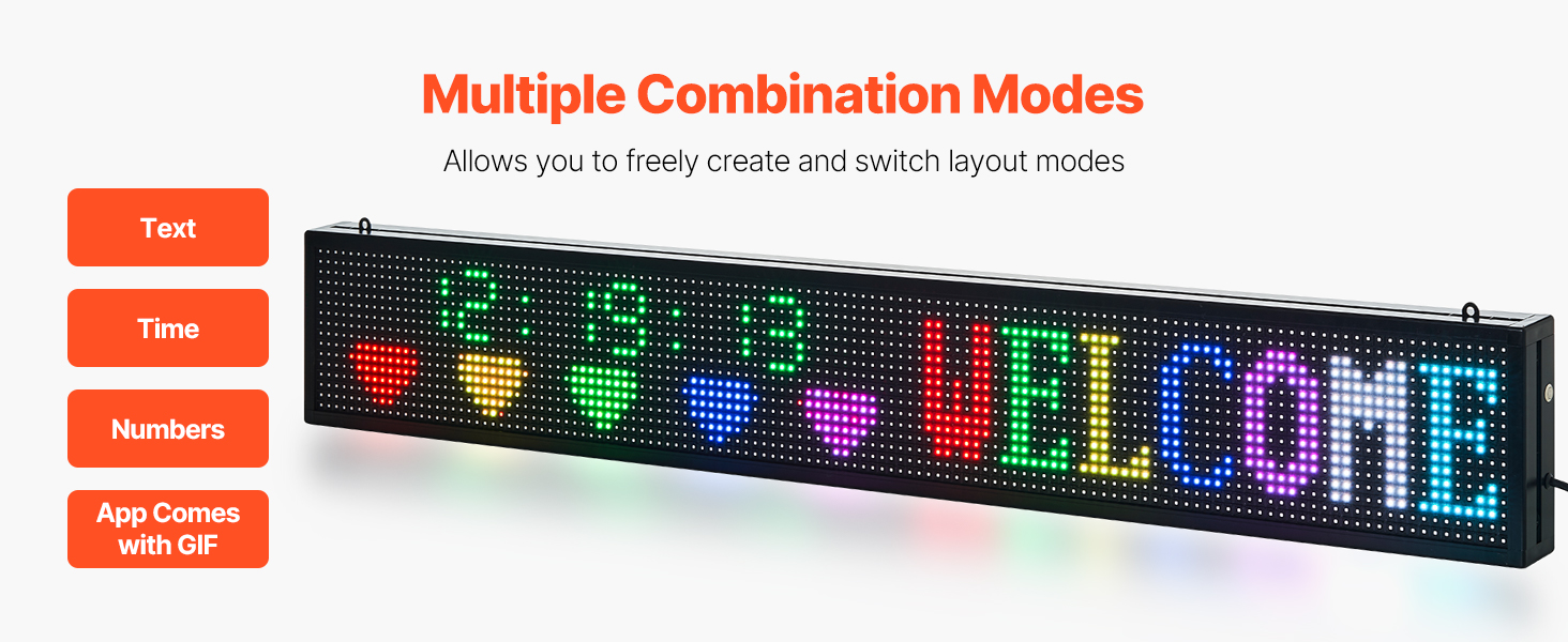 Podporuje rolovanie textu, časy a GIF. Farebné, dynamické zobrazenia textu upútajú pozornosť okoloidúcich.