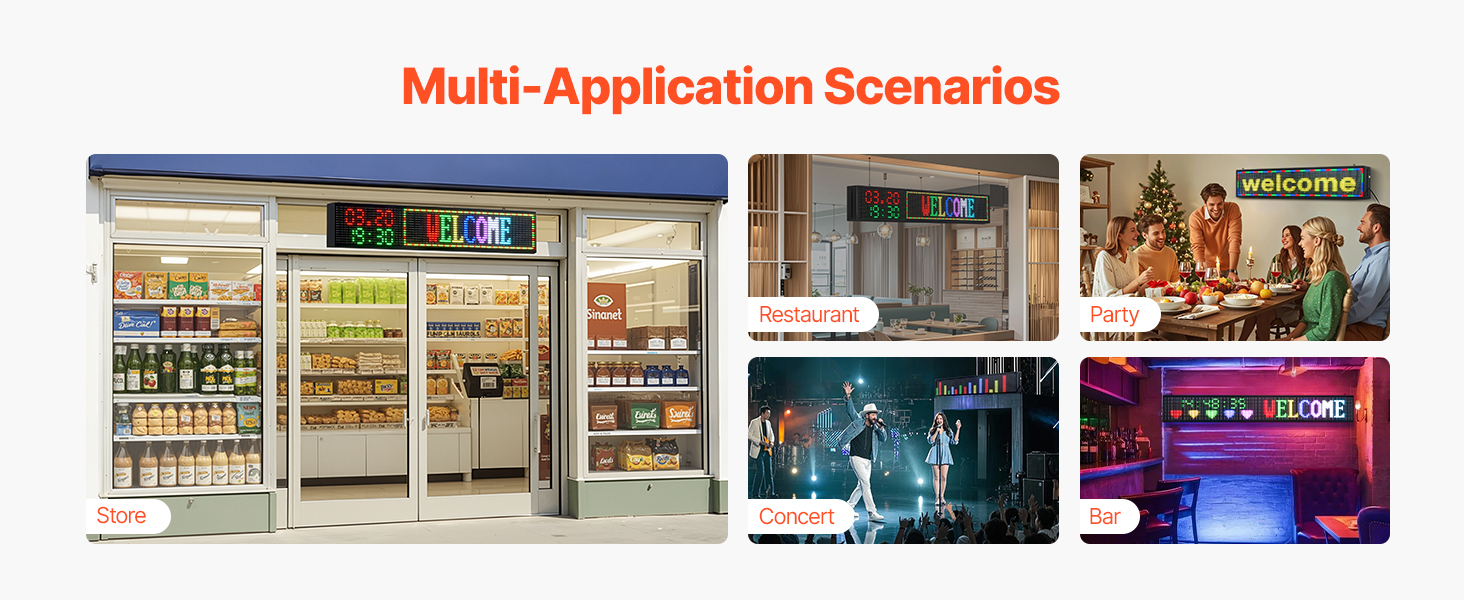 Táto programovateľná led tabuľa je vhodná do obchodov, hotelov, výkladov, nákupných centier, domácností, kancelárií, kaviarní, barov, reštaurácií atď. Môžete ho použiť na reklamu a propagáciu.