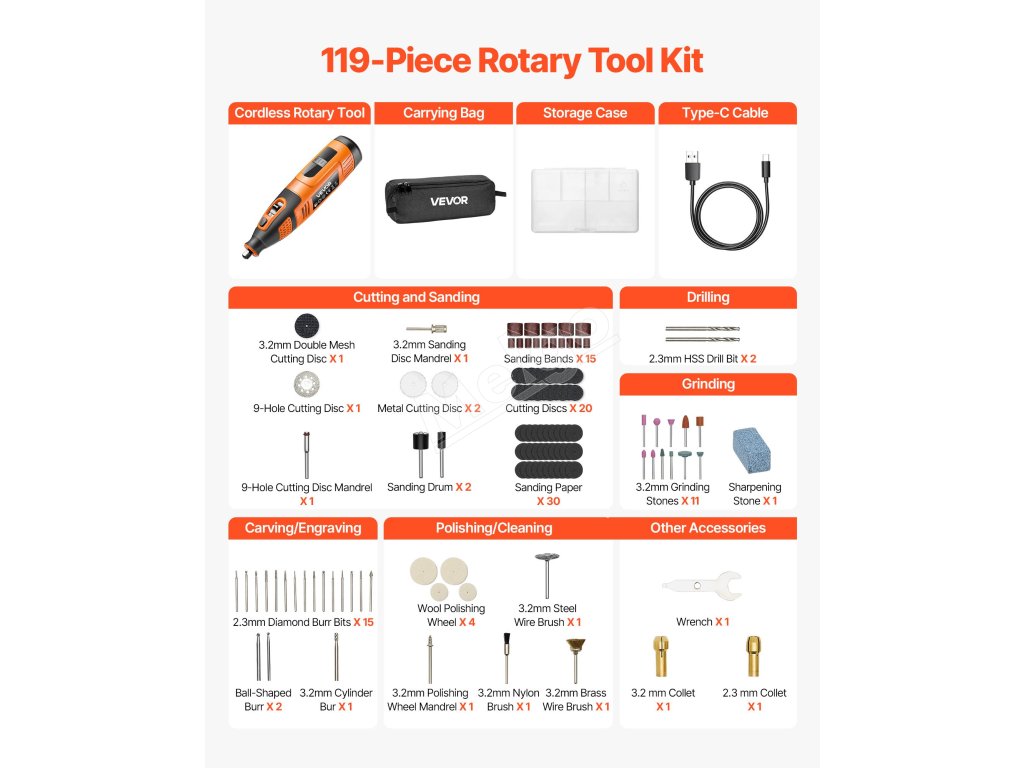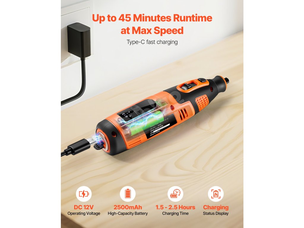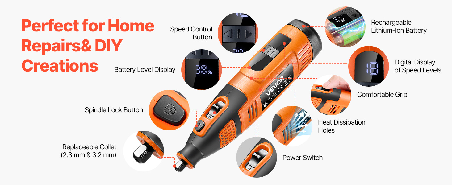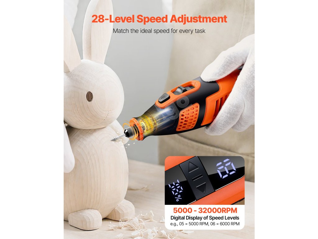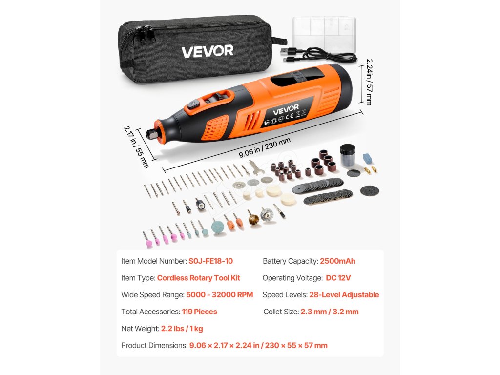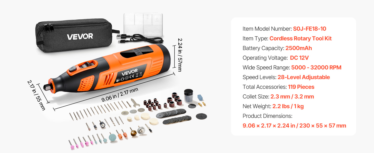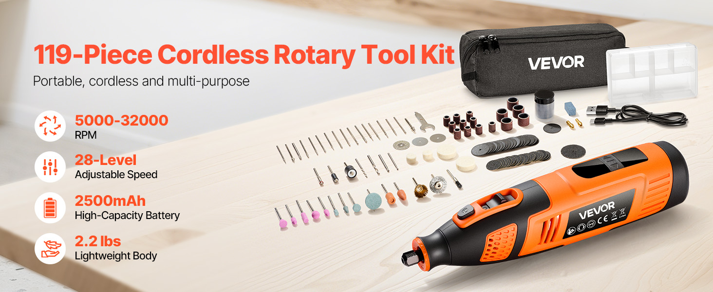 Akumulátorová súprava rotačného náradia VEVOR DC12V so 119 dielmi poskytuje všestranné funkcie na rezanie, brúsenie, vŕtanie, brúsenie, rezbárstvo, gravírovanie, leštenie a čistenie. Vďaka 28 nastaviteľným otáčkam (5000-32000 ot./min.) a štíhlemu, ľahkému dizajnu je ideálna na rôzne kreatívne projekty pre domácich majstrov.