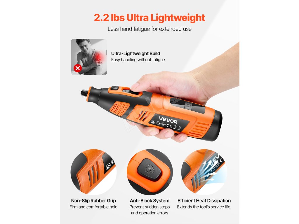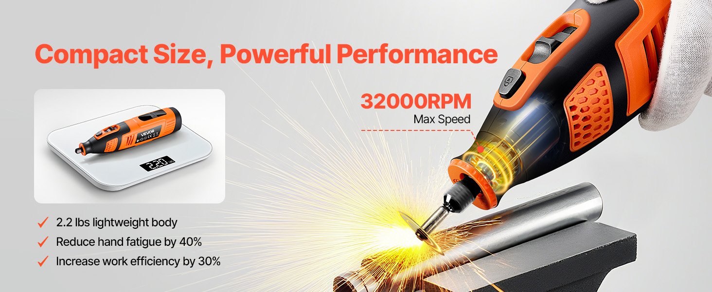 Toto elektrické rotačné náradie sa môže pochváliť maximálnou rýchlosťou 32 000 otáčok za minútu, vďaka čomu dokončí úlohy rýchlo a efektívne. Jeho ľahká konštrukcia v kombinácii s ergonomickou rukoväťou zaisťuje pohodlie počas dlhodobého používania a zvyšuje presnosť a účinnosť.
