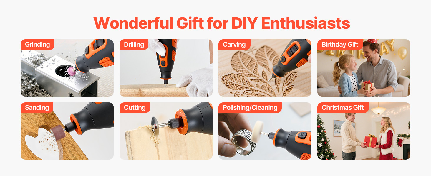 Tento multifunkčný rotačný nástroj pre domácich majstrov, ktorý je ideálnym darčekom pre nadšencov, si ľahko poradí s úlohami brúsenia, vŕtania, rezania, brúsenia, rezania a leštenia/čistenia. Dokončite všetky svoje kreatívne projekty bez námahy!