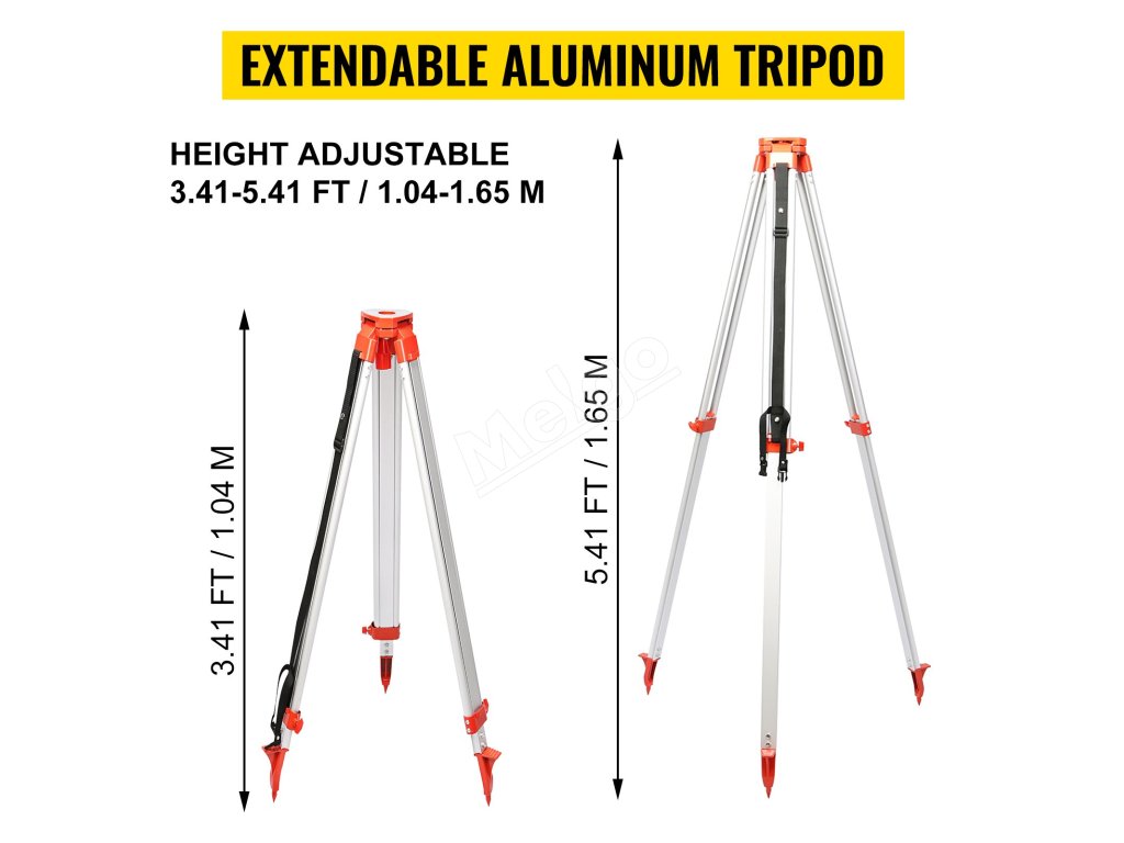 Táto súprava laserového nivelačného náradia pozostáva z laserovej vodováhy, statívu s dĺžkou 5,41 ft/1,65 m a palice s dĺžkou 16,4 ft/5 m, ktoré sú vyrobené z pevných, ale ľahkých plastových a hliníkových materiálov. Táto laserová vodováha s pracovnou vzdialenosťou 1640,42 ft/500 m a konštrukciou otočnou o 360 stupňov vytvára stabilné skenovacie čiary pre maximálnu viditeľnosť za svetelných podmienok. Vďaka nastaviteľnej výške a vodorovnej základni môže statív držať viacero geodetických zariadení na rôzne nivelačné a meracie účely. Naše výrobky sú vhodné na použitie v stavebníctve, na železnici, pri údržbe ciest a na iné vonkajšie použitie.