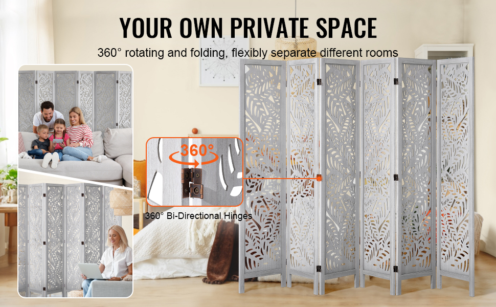 Panely tejto zásteny na ochranu súkromia' sa spájajú pomocou troch dvojsmerných pántov, ktoré umožňujú otáčanie o 360° a flexibilné uhly skladania, pričom zabezpečujú stabilitu.