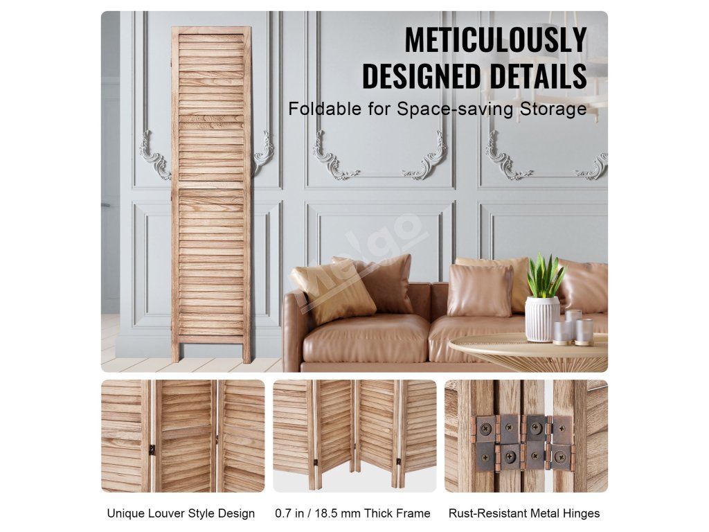 Tento rozdeľovač izieb má európsky minimalistický dizajn so žalúziami a 360° otočnými panelmi, ktoré sa ľahko skladajú. Je vyrobený z odolného dreva Paulownia a je ideálny na oddelenie priestorov, zabezpečenie súkromia a zatienenie slnka.