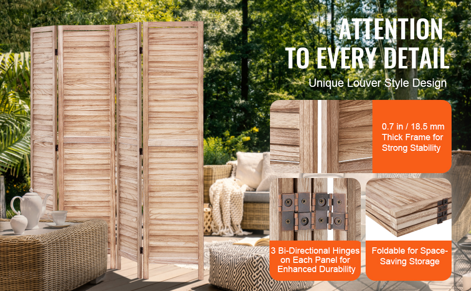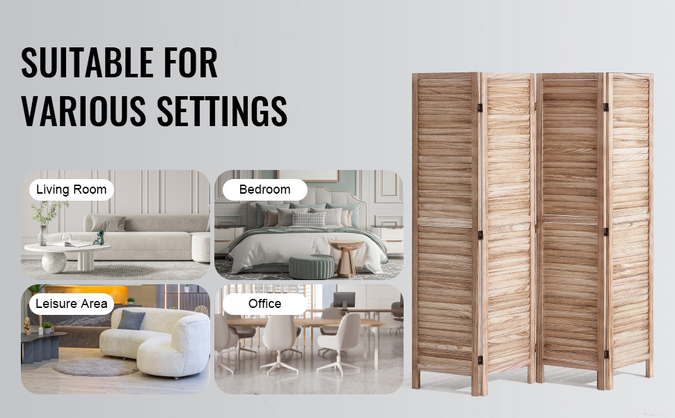 Tento rozdeľovač izieb má európsky minimalistický dizajn so žalúziami a 360° otočnými panelmi, ktoré sa ľahko skladajú. Je vyrobený z odolného dreva Paulownia a je ideálny na oddelenie priestorov, zabezpečenie súkromia a zatienenie slnka.