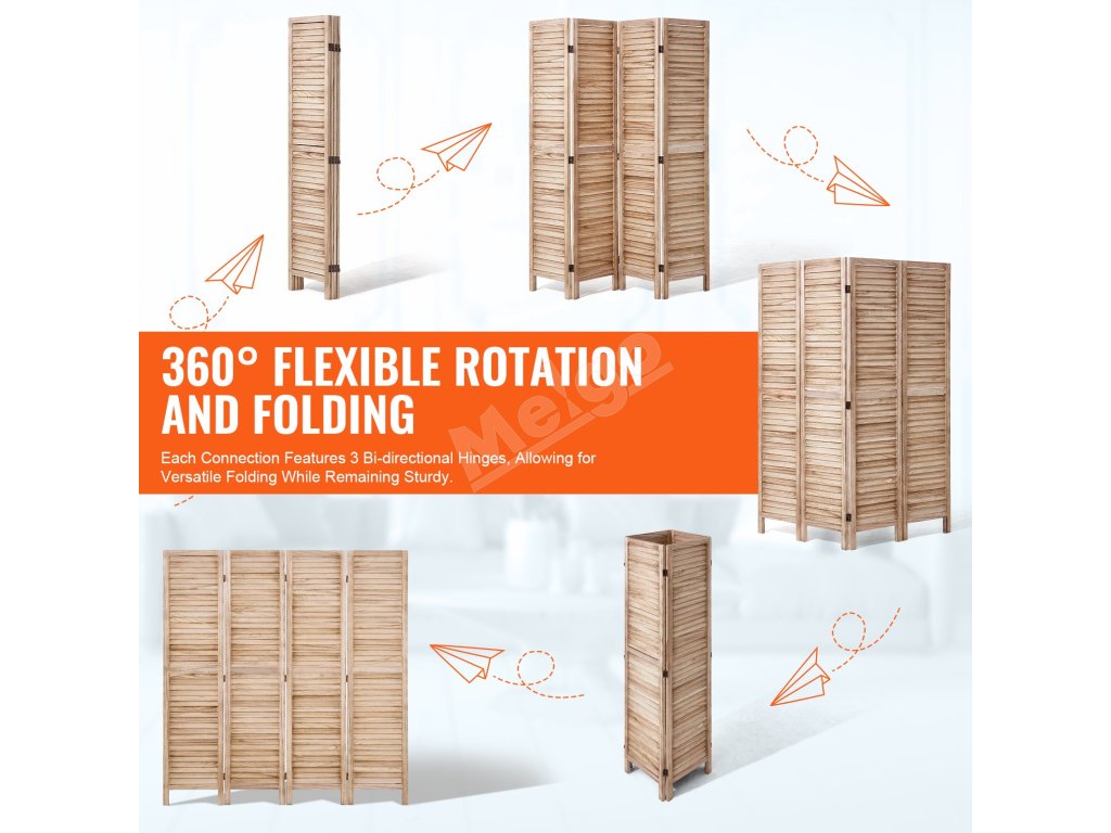 Tento rozdeľovač izieb má európsky minimalistický dizajn so žalúziami a 360° otočnými panelmi, ktoré sa ľahko skladajú. Je vyrobený z odolného dreva Paulownia a je ideálny na oddelenie priestorov, zabezpečenie súkromia a zatienenie slnka.