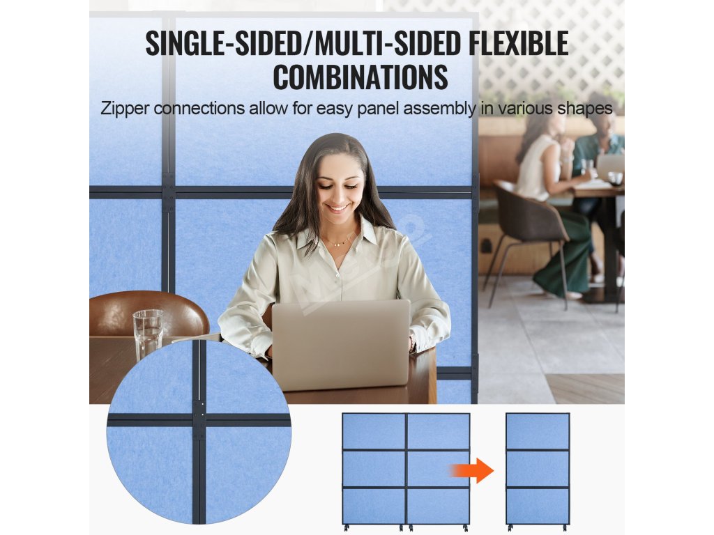 Vďaka systému pripojenia na zips možno tento rozdeľovač použiť ako samostatný paraván v stiesnených priestoroch alebo ho možno ľahko kombinovať s inými panelmi a vytvoriť tak väčšiu prenosnú priečku.
