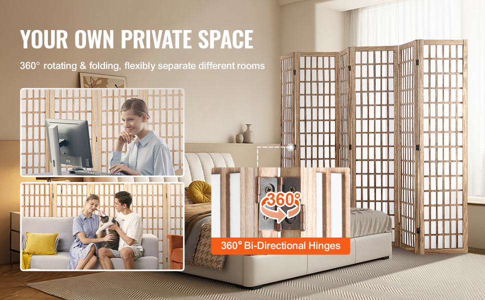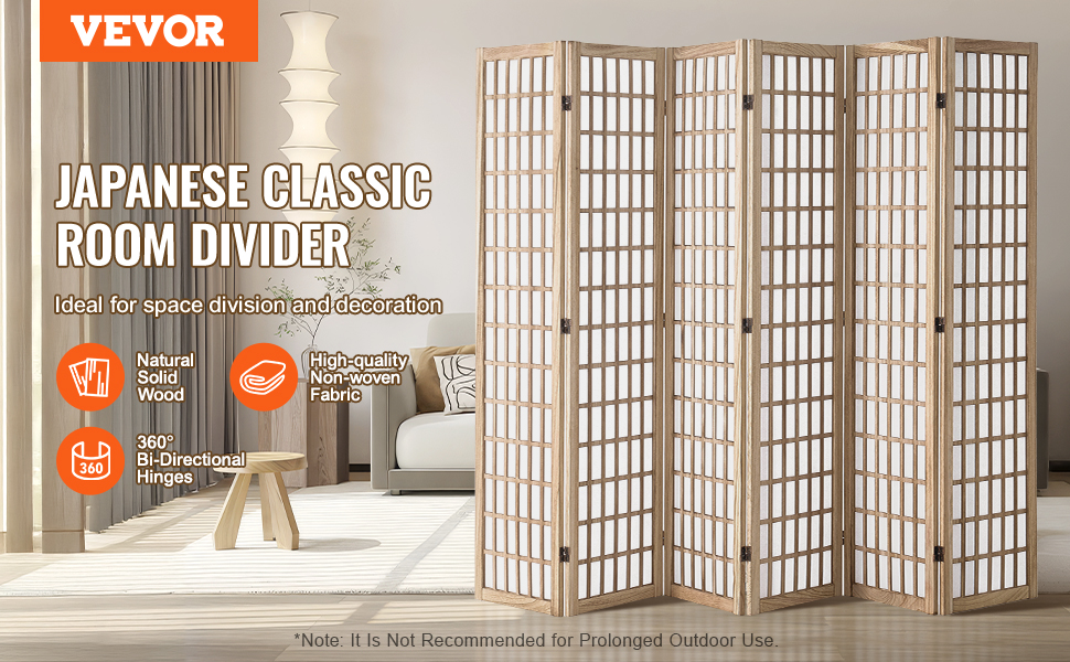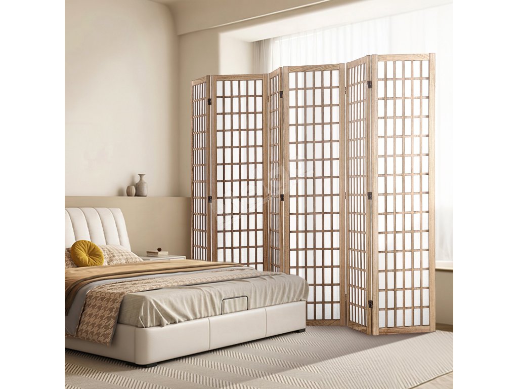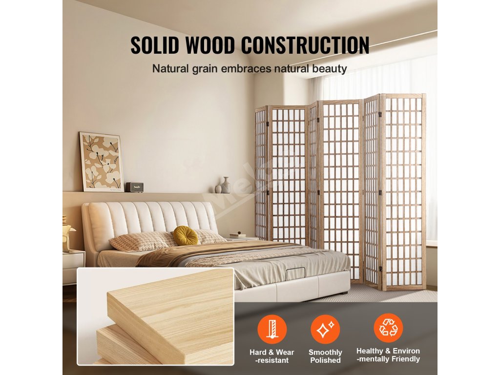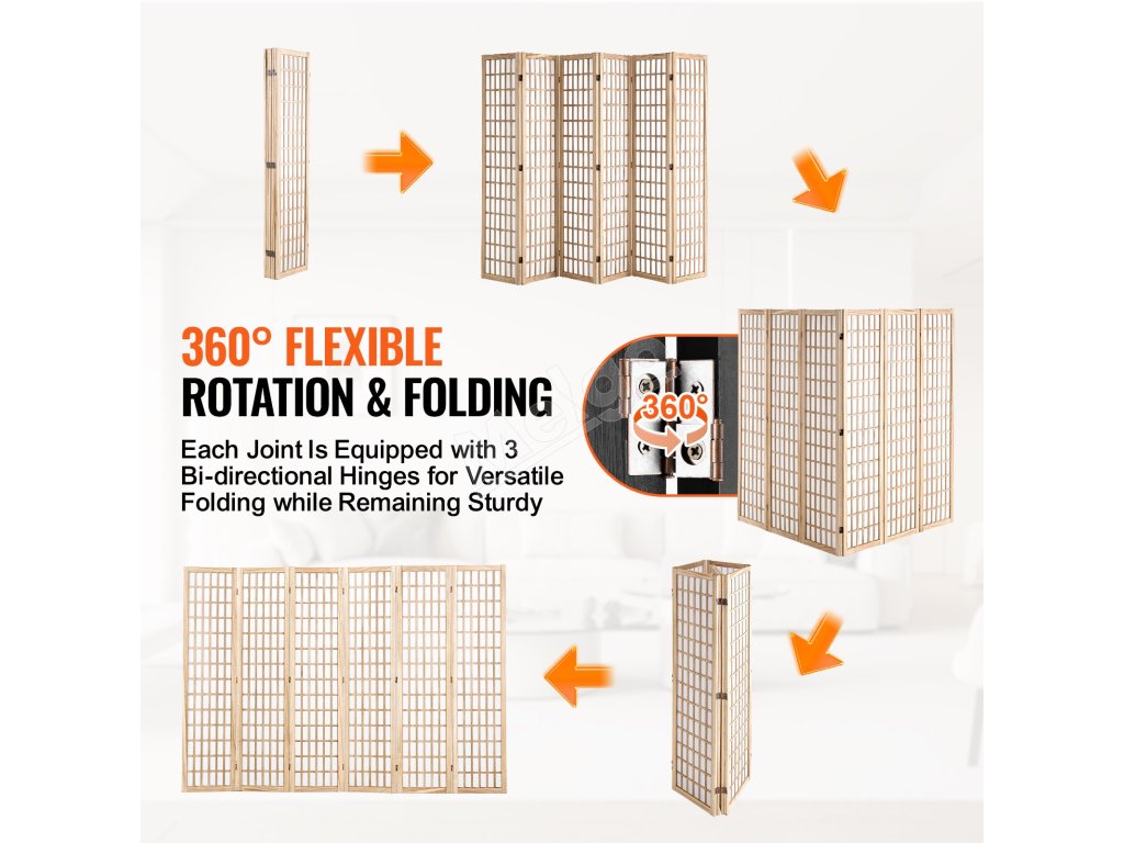 Tento rozdeľovač izieb má japonský minimalistický dizajn s drevenou mriežkou. Otáča sa o 360° a ľahko sa skladá na uskladnenie. Je vyrobený z odolného masívneho dreva a nepremokavej tkaniny a dodá súkromie a štýl každému priestoru.