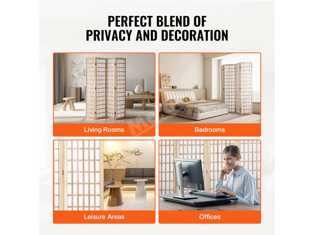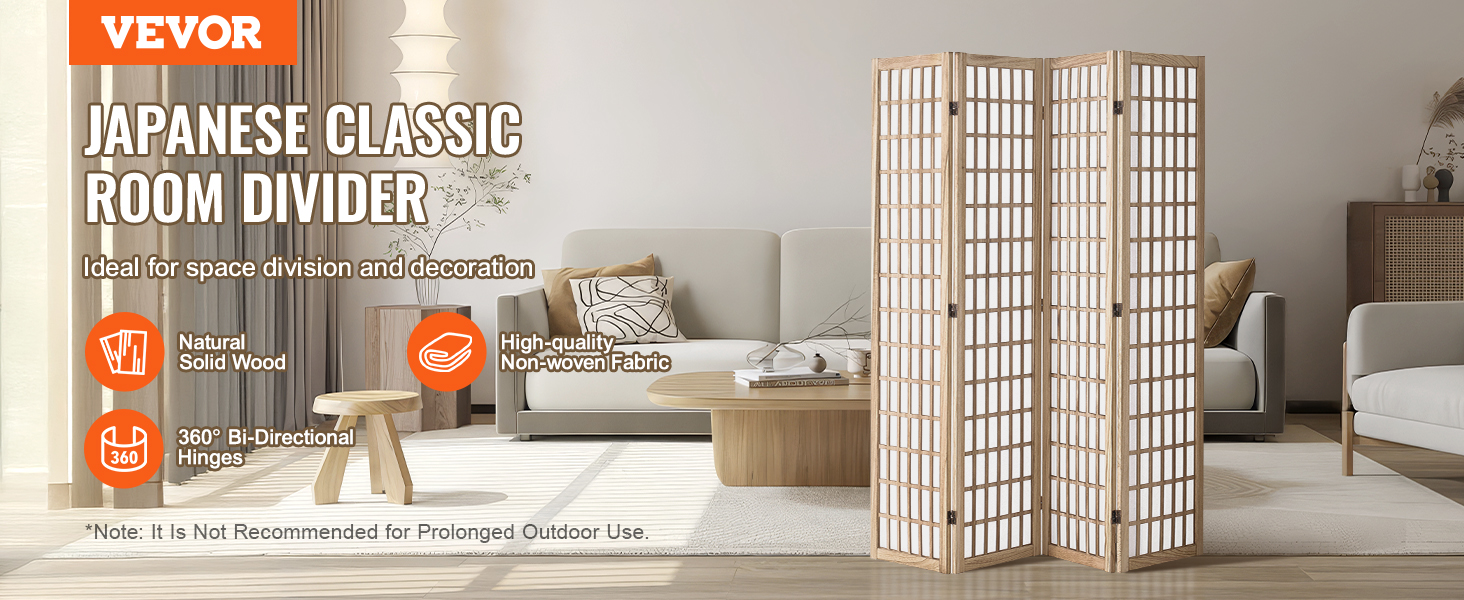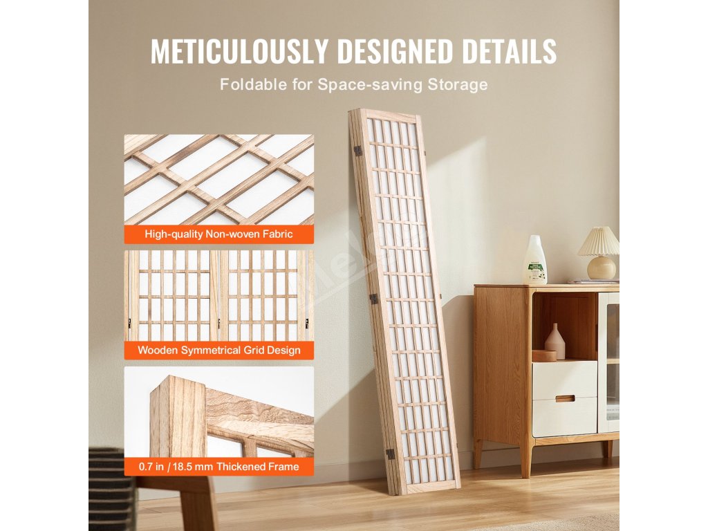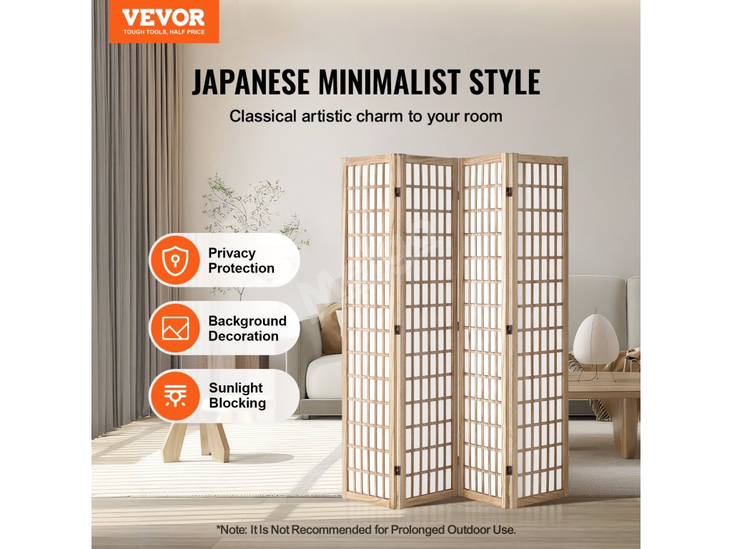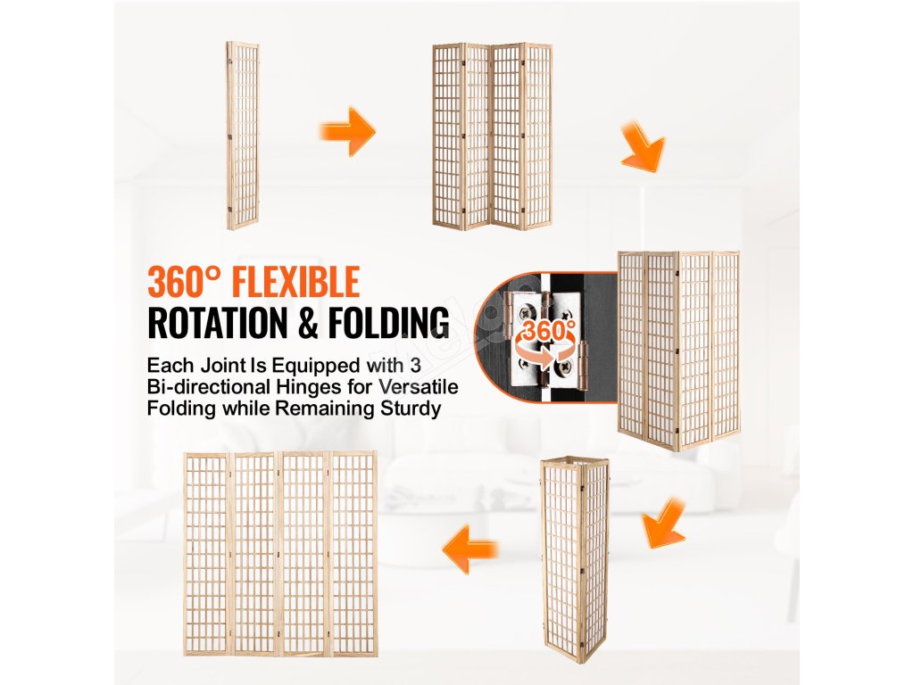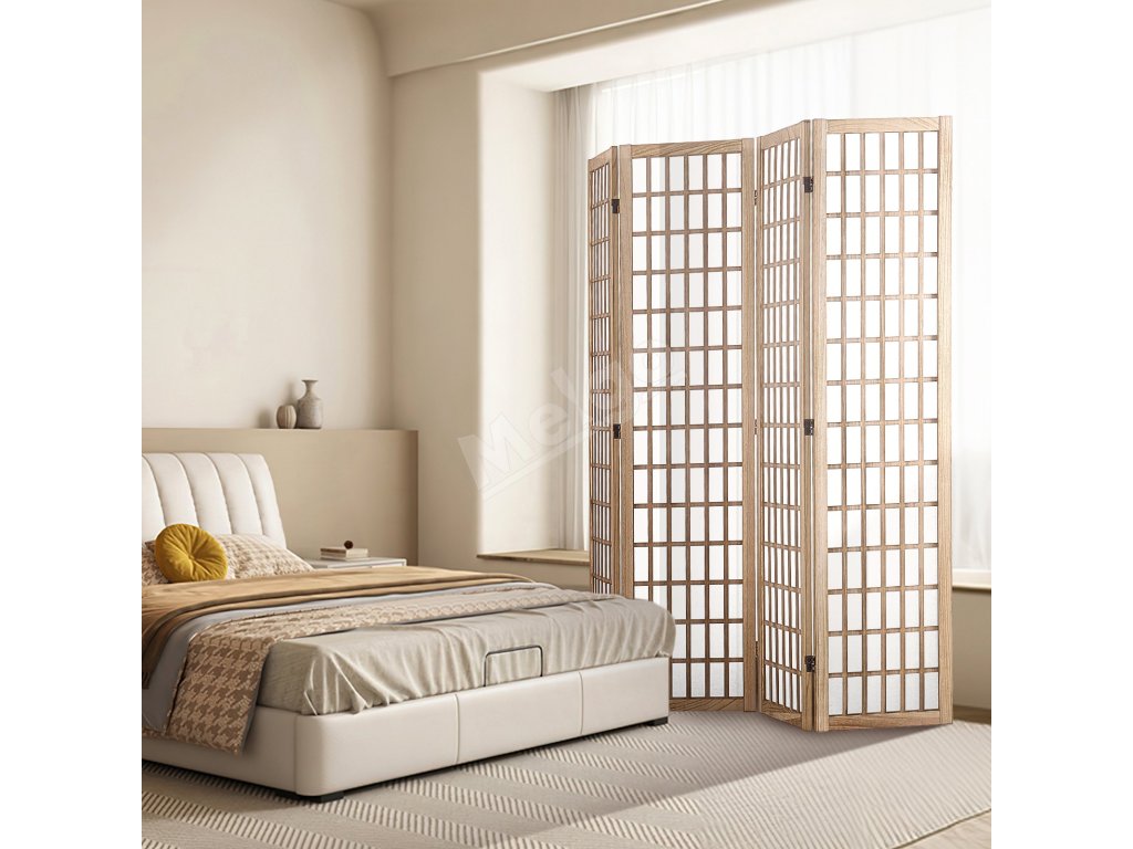 Tento rozdeľovač izieb má japonský minimalistický dizajn s dreveným roštom. Otáča sa o 360° a ľahko sa skladá na uskladnenie. Je vyrobený z odolného masívneho dreva a nepremokavej tkaniny a dodá súkromie a štýl každému priestoru.