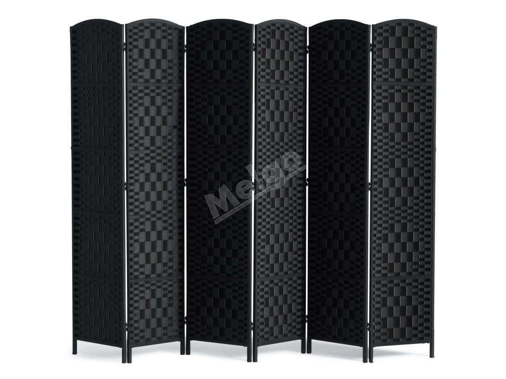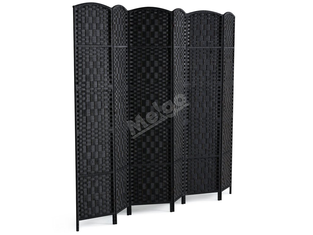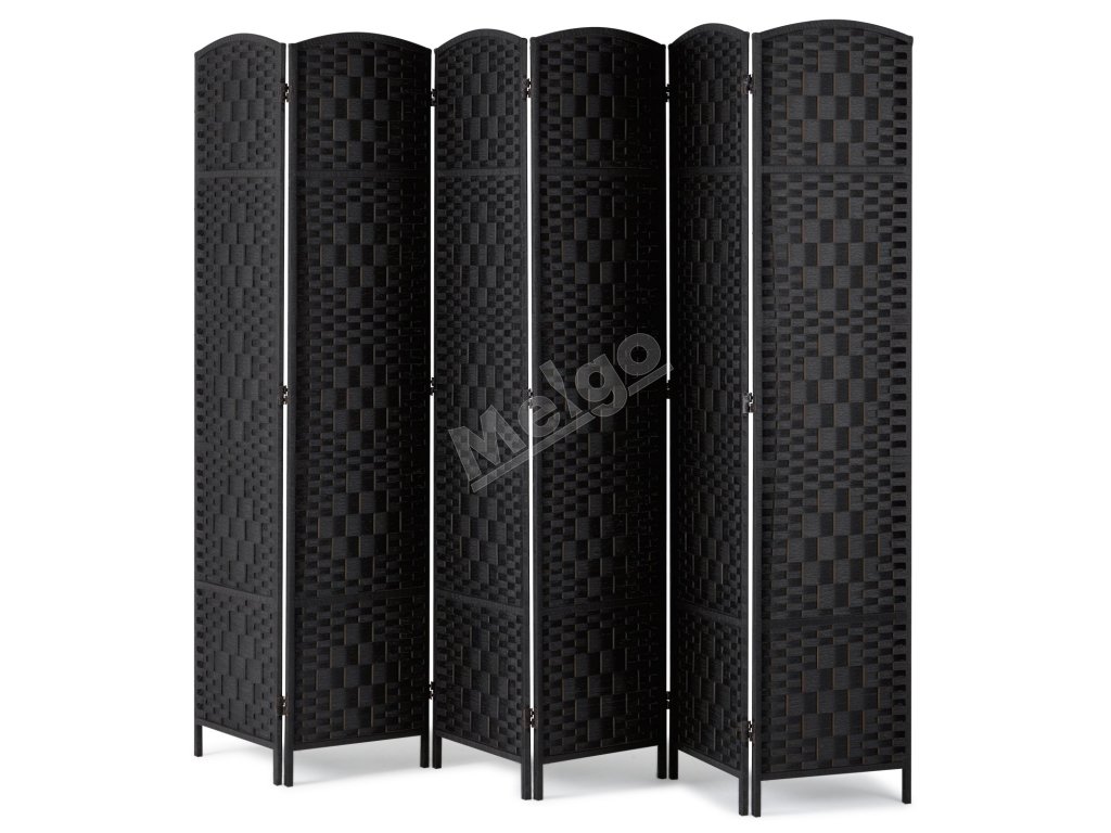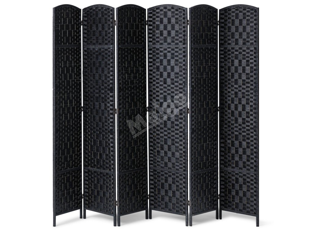 Skladací 6-panelový paraván, ručne tkaný, prenosný, čierny, s pántmi