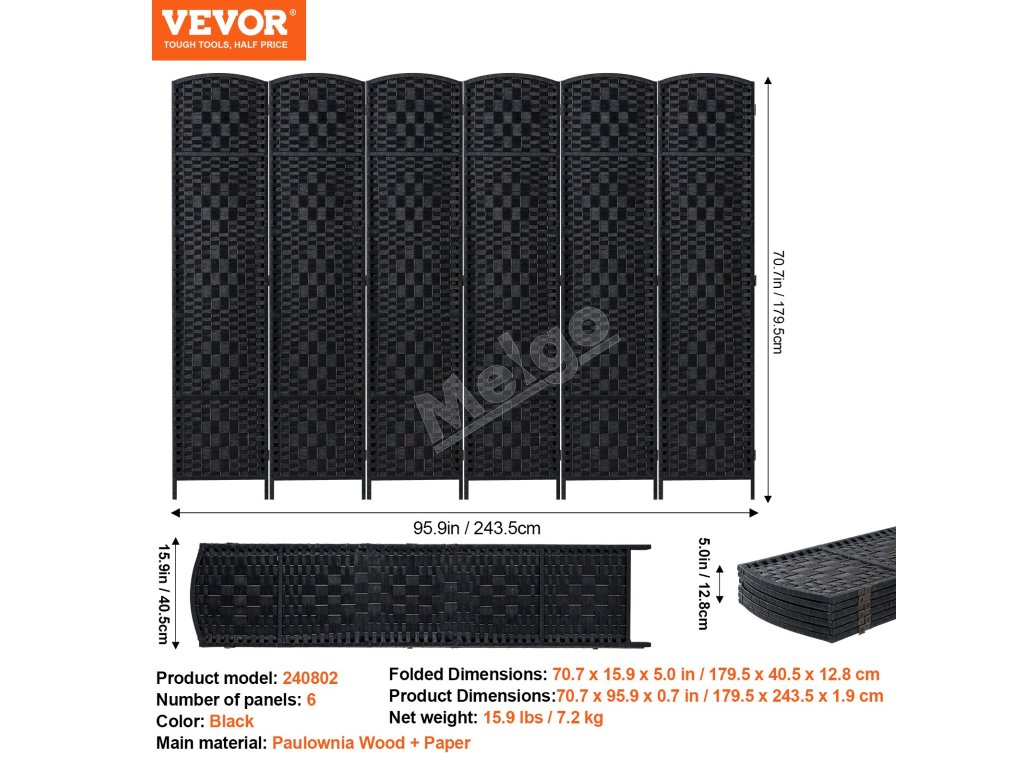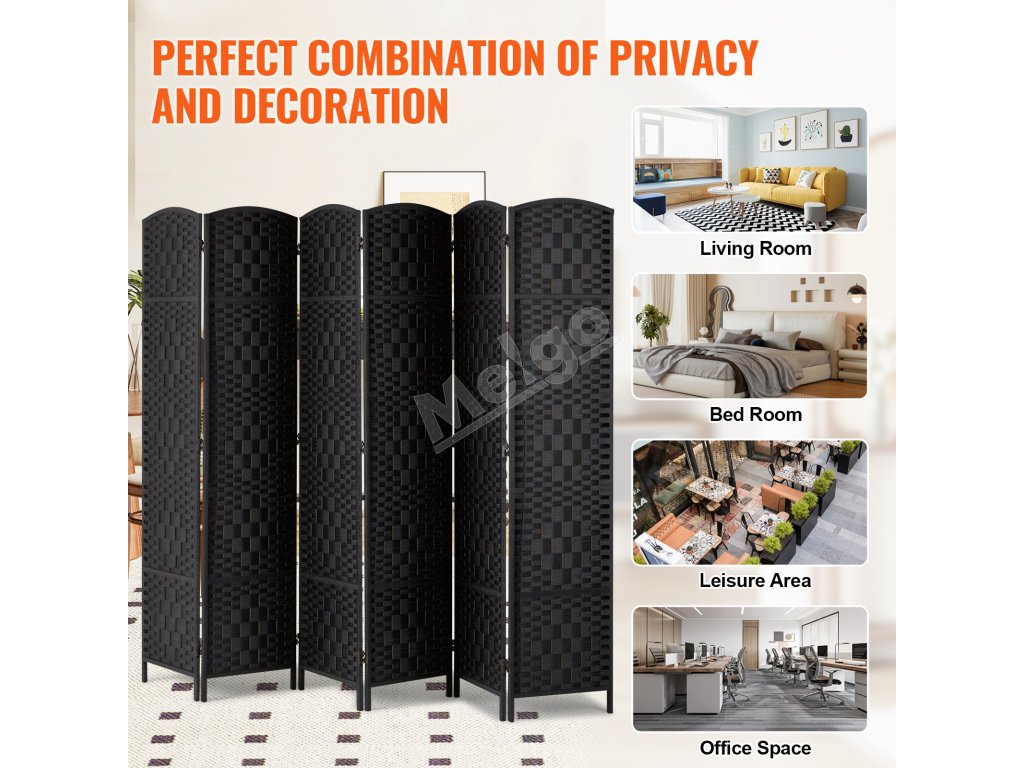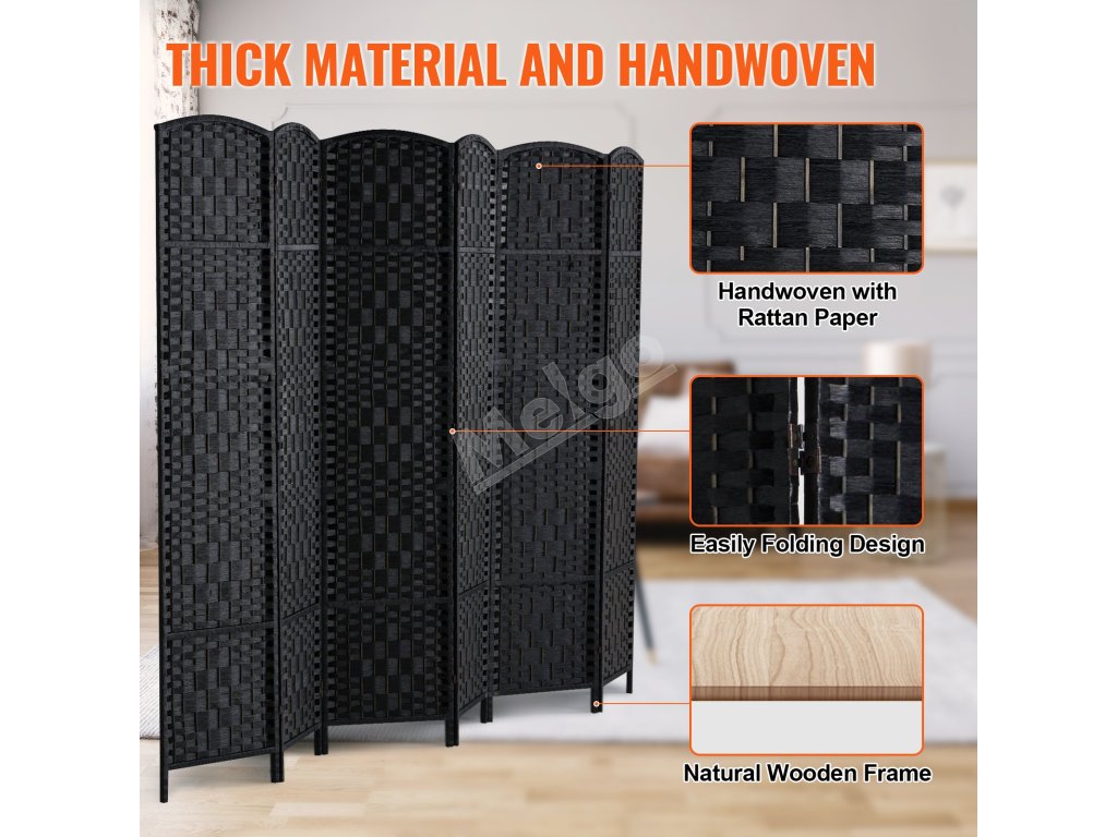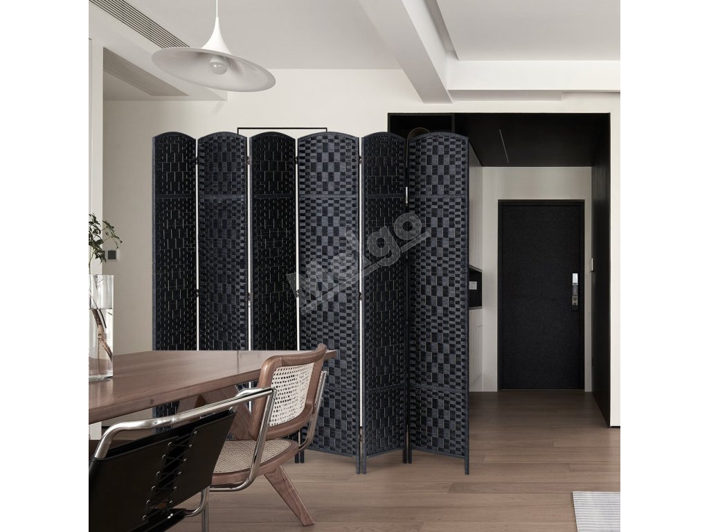 Skladací 6-panelový paraván, ručne tkaný, prenosný, čierny, s pántmi