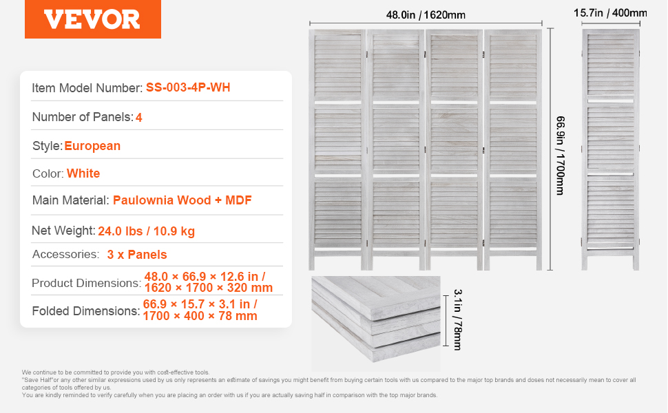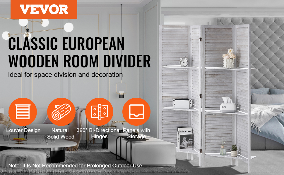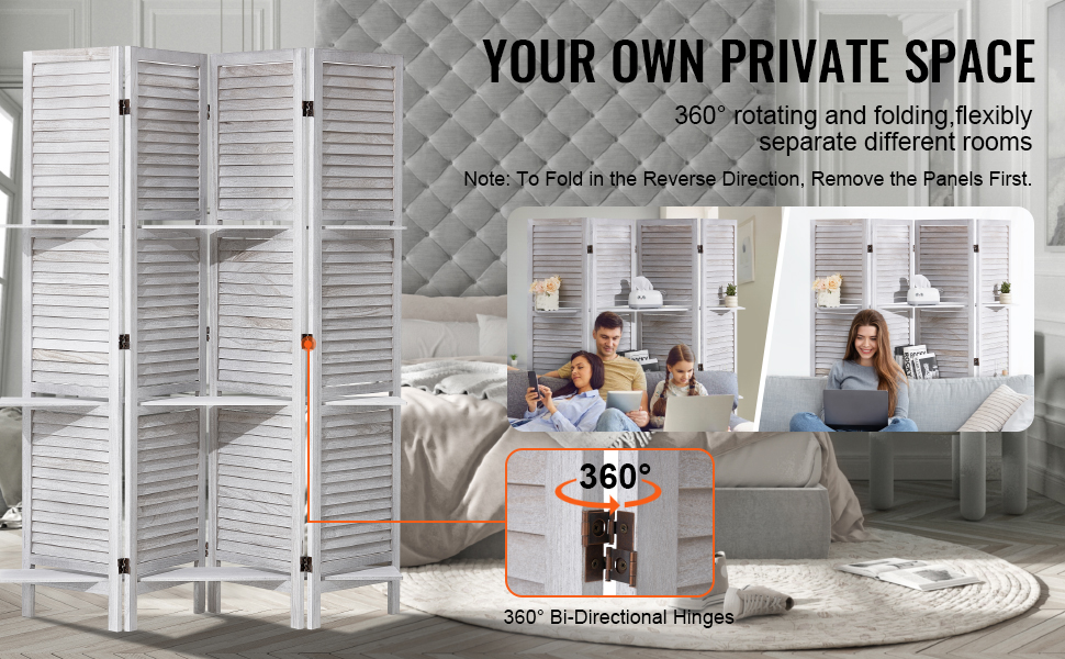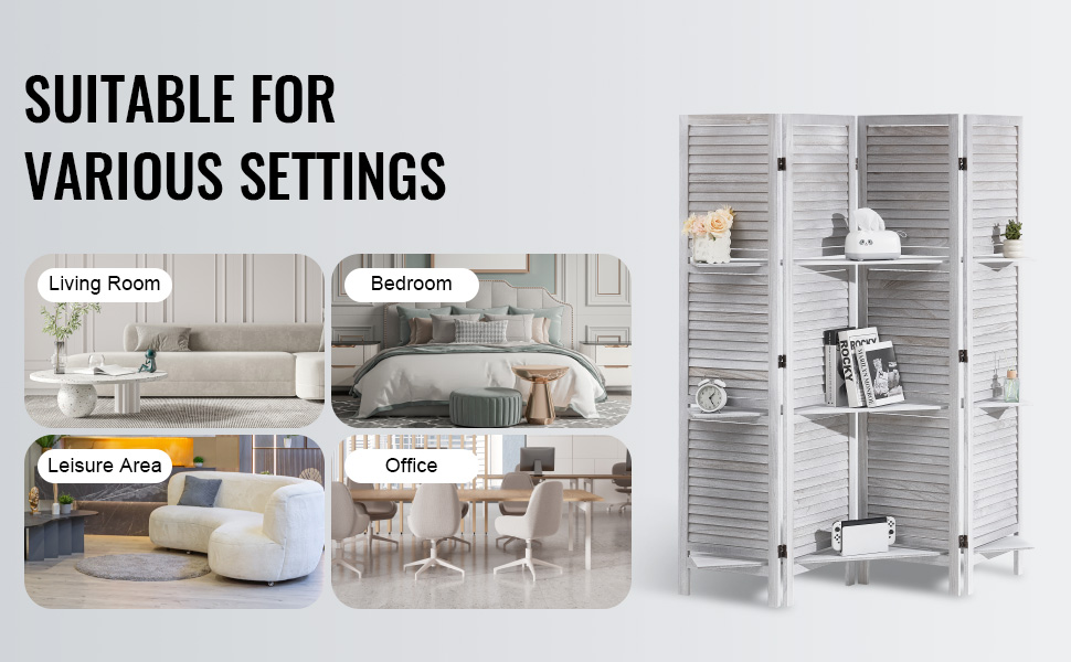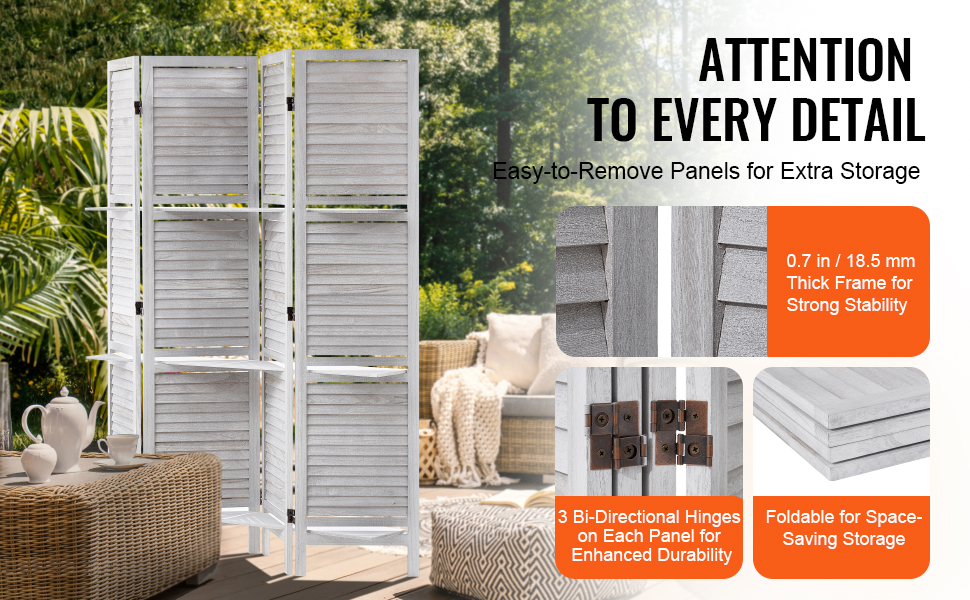 Tento rozdeľovač izieb má minimalistický dizajn so žalúziami a tromi policami. Panely sa otáčajú o 360°a ľahko sa skladajú. Je vyrobený z odolného dreva Paulownia a je ideálny na zabezpečenie súkromia a zatienenie pred slnkom.
