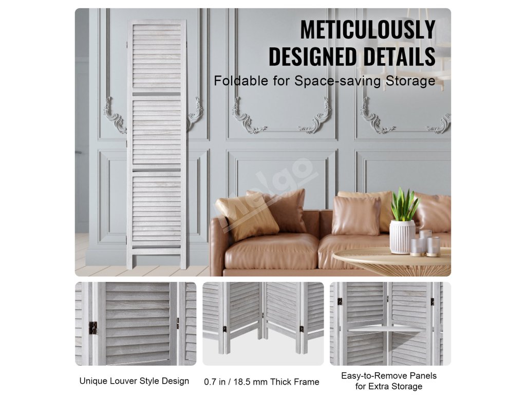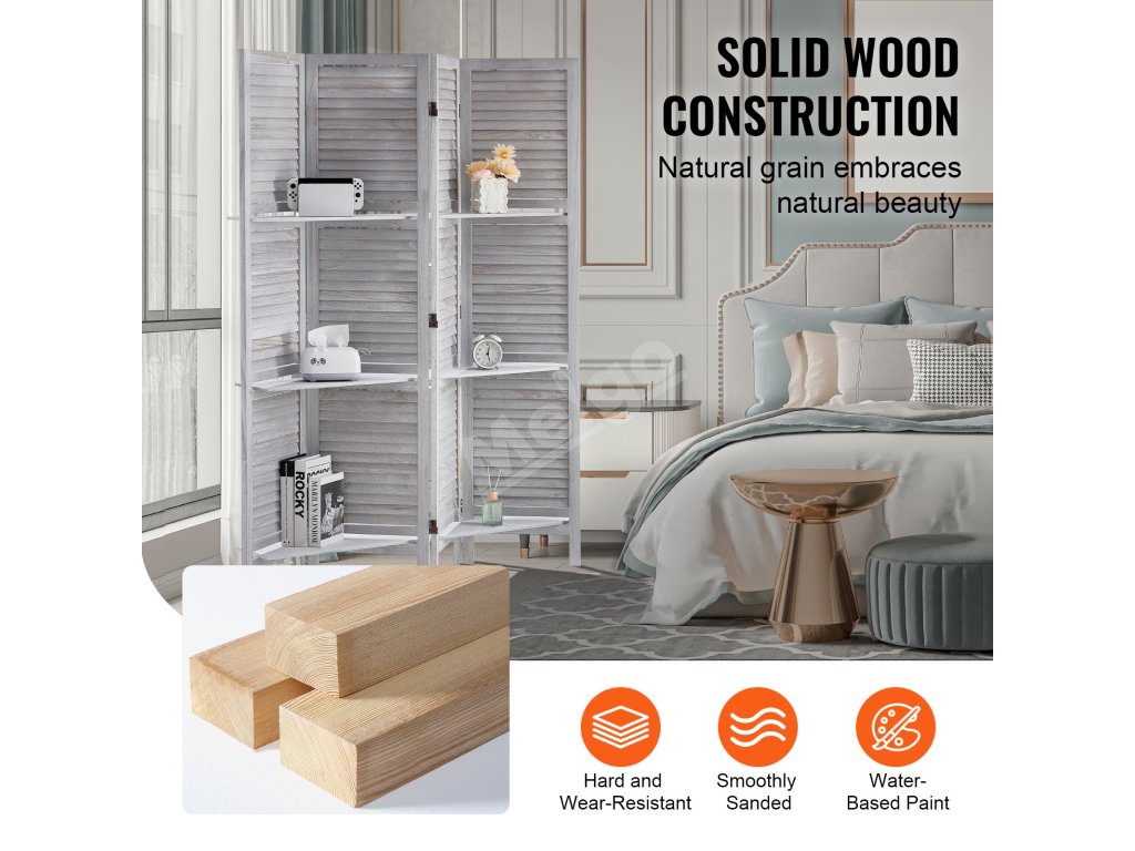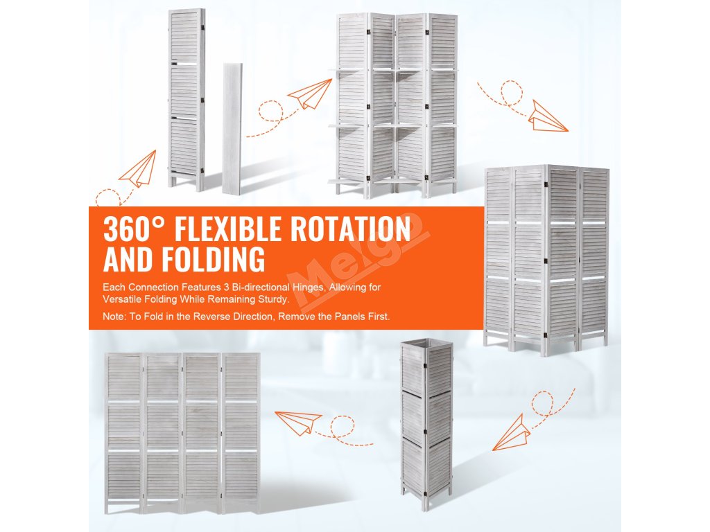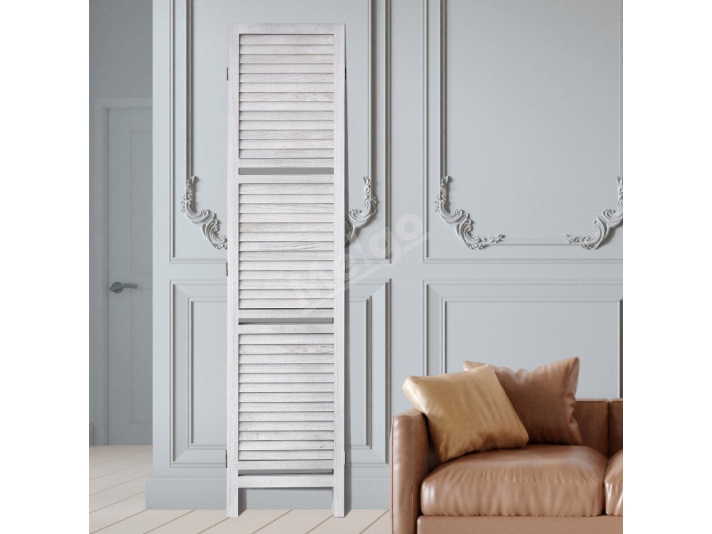 Tento rozdeľovač izieb má minimalistický dizajn so žalúziami a tromi policami. Panely sa otáčajú o 360°a ľahko sa skladajú. Je vyrobený z odolného dreva Paulownia a je ideálny na zabezpečenie súkromia a zatienenie pred slnkom.