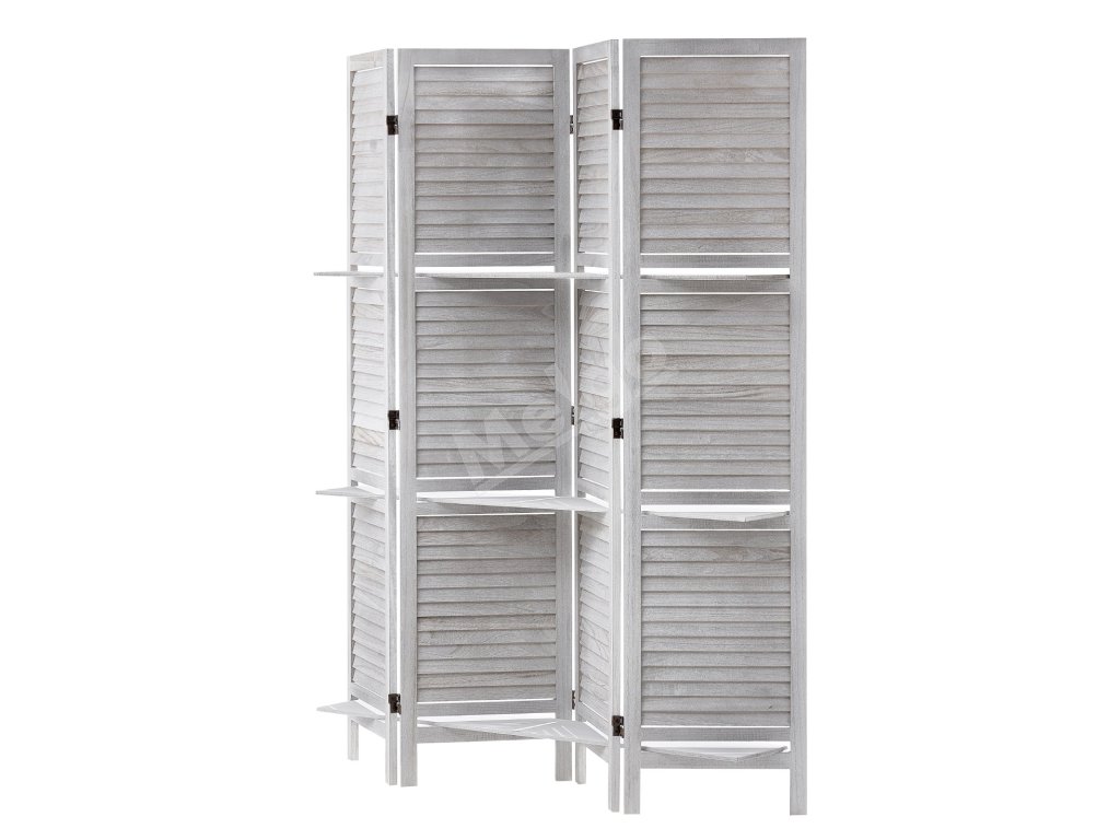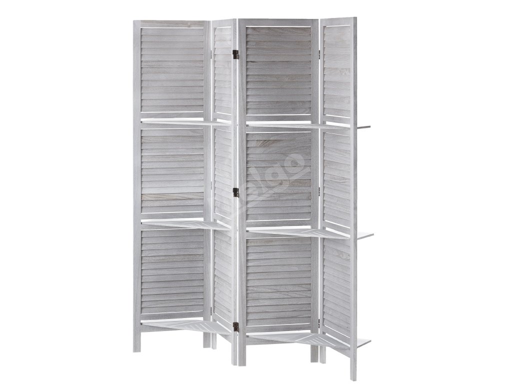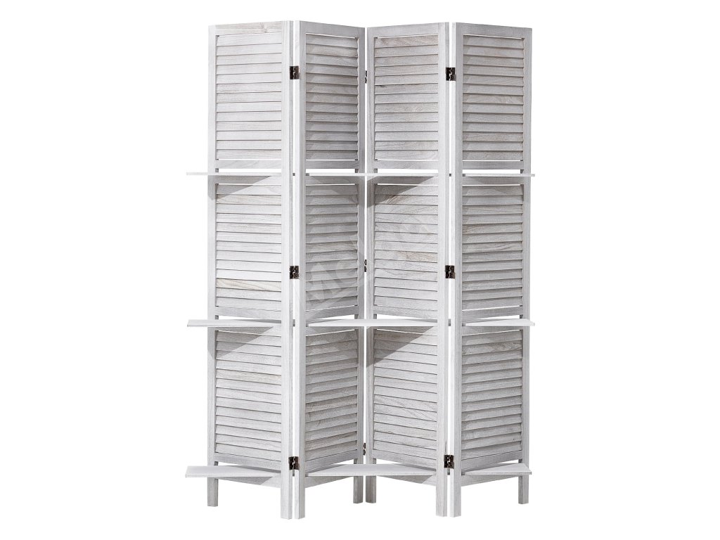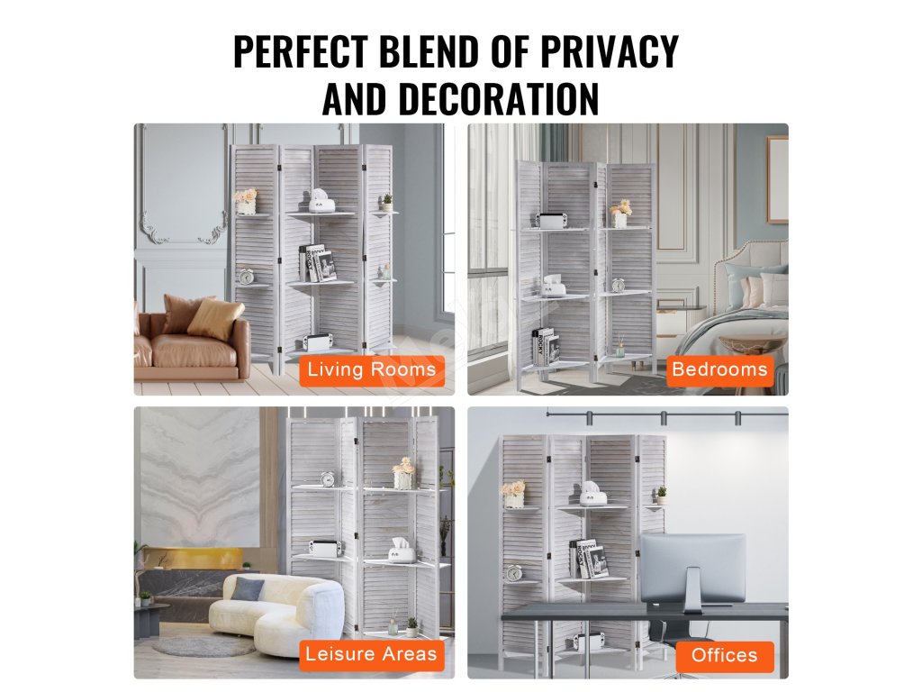 Tento rozdeľovač izieb má minimalistický dizajn so žalúziami a tromi policami. Panely sa otáčajú o 360°a ľahko sa skladajú. Je vyrobený z odolného dreva Paulownia a je ideálny na zabezpečenie súkromia a zatienenie pred slnkom.