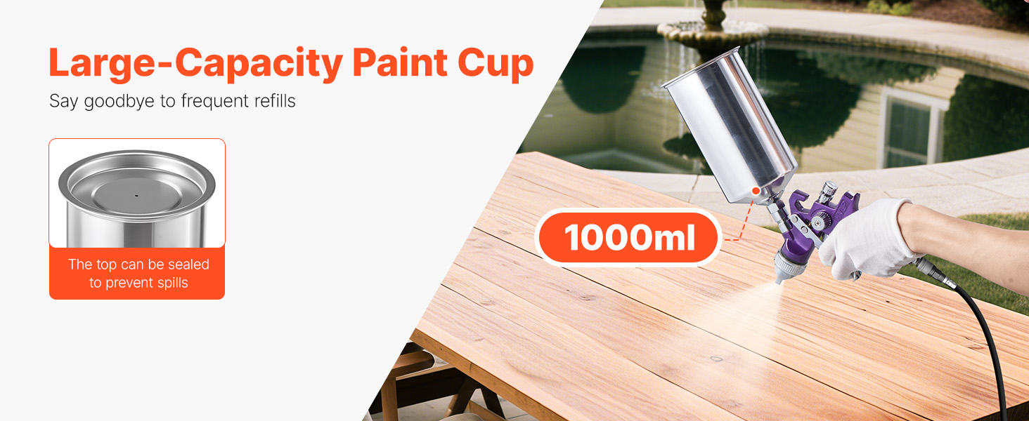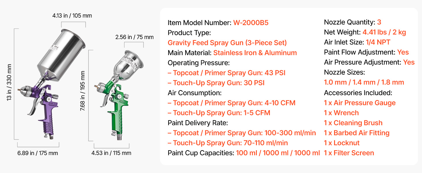 Trojdielna súprava vzduchovej striekacej pištole VEVOR sa dodáva s 1,0 mm tryskou a 100 ml pohárikom, 1,4 mm tryskou a 1000 ml pohárikom a 1,8 mm tryskou a 1000 ml pohárikom, čo znižuje potrebu častého dopĺňania a umožňuje pohodlné prepínanie medzi rôznymi farbami na rôzne úlohy striekania.