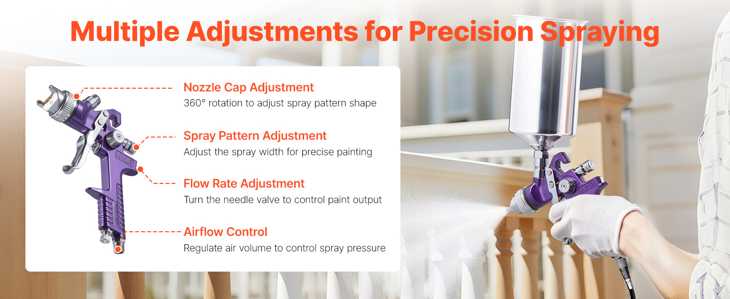 Gravitačná striekacia pištoľ je vybavená 360° otočným uzáverom trysky a tromi nezávislými gombíkmi na ovládanie vzoru striekania, prietoku farby a množstva vzduchu, ktoré poskytujú hladké a konzistentné nátery na splnenie širokého spektra maliarskych potrieb.