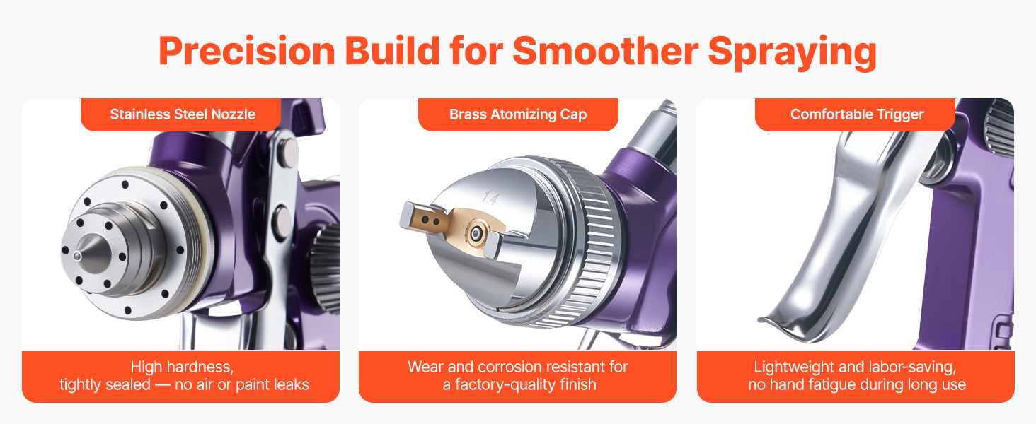 Odolné trysky z nehrdzavejúceho železa a hliníkový rozprašovací uzáver pomáhajú predchádzať únikom vzduchu a farby, Citlivá spúšť a ergonomická rukoväť znižujú únavu rúk a zabezpečujú presnejšie ovládanie striekania.