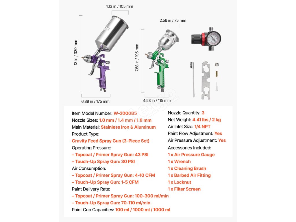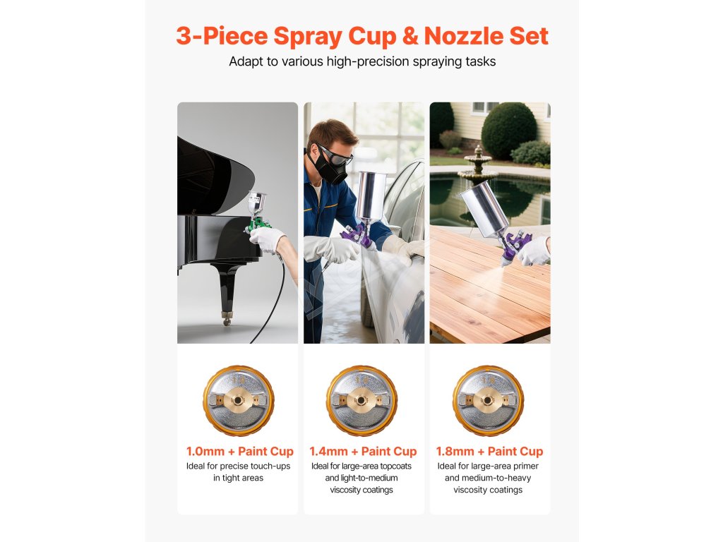 Trojdielna súprava vzduchovej striekacej pištole VEVOR sa dodáva s 1,0 mm tryskou a 100 ml pohárikom, 1,4 mm tryskou a 1000 ml pohárikom a 1,8 mm tryskou a 1000 ml pohárikom, čo znižuje potrebu častého dopĺňania a umožňuje pohodlné prepínanie medzi rôznymi farbami na rôzne úlohy striekania.