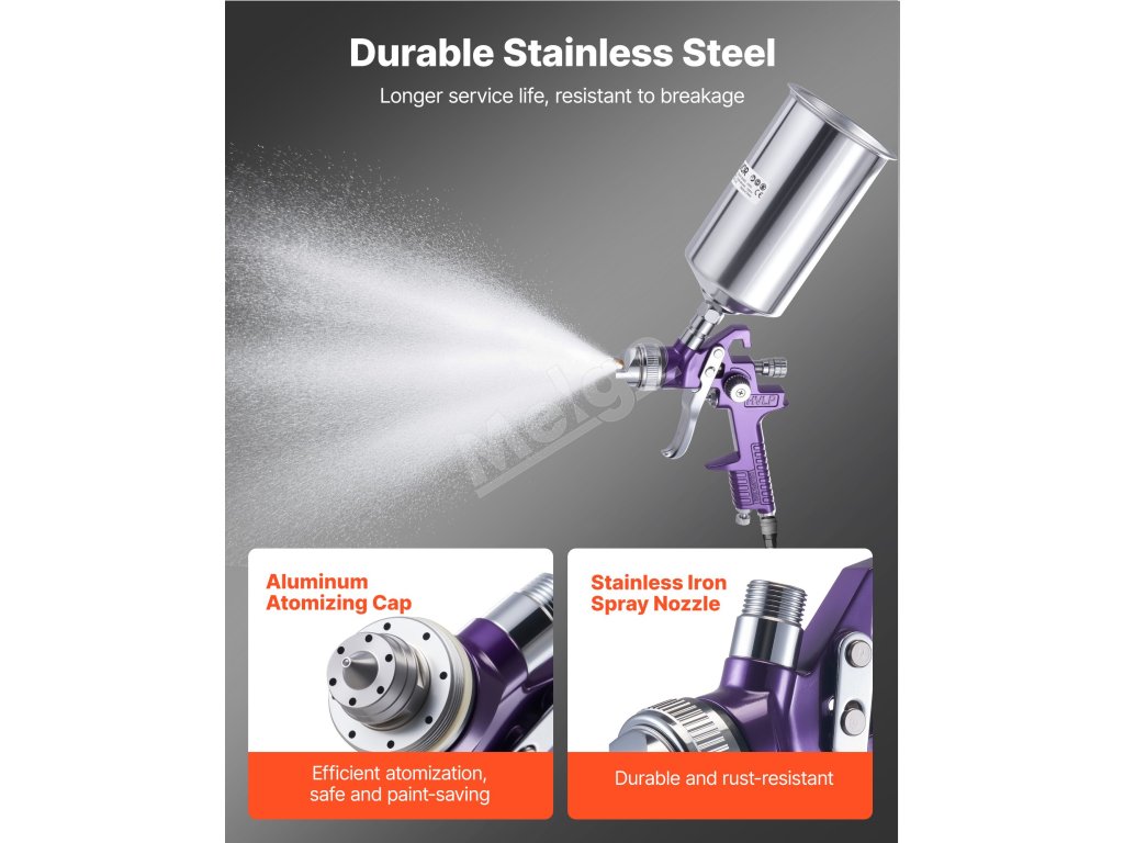 Odolné trysky z nehrdzavejúceho železa a hliníkový rozprašovací uzáver pomáhajú predchádzať únikom vzduchu a farby, Citlivá spúšť a ergonomická rukoväť znižujú únavu rúk a zabezpečujú presnejšie ovládanie striekania.