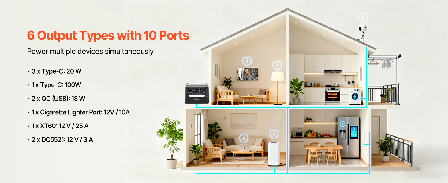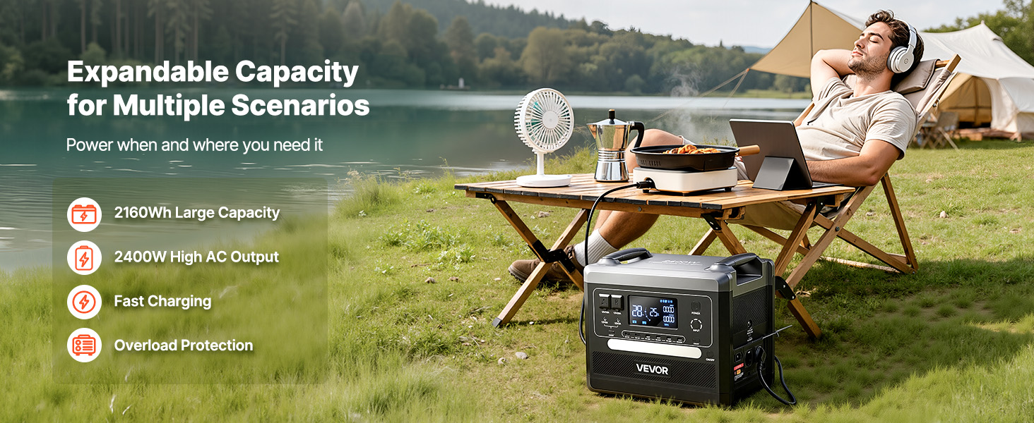 Prenosná elektráreň VEVOR 2400W je spoľahlivé riešenie pre napájanie na cestách. S 10 výstupnými portmi, vysokokapacitnou batériou LiFePO₄ s kapacitou 2160 Wh, rozširovateľnou kapacitou a univerzálnymi možnosťami nabíjania poskytuje nepretržité a spoľahlivé napájanie. Ideálna na kempovanie, stretnutia v prírode a rodinné výlety.