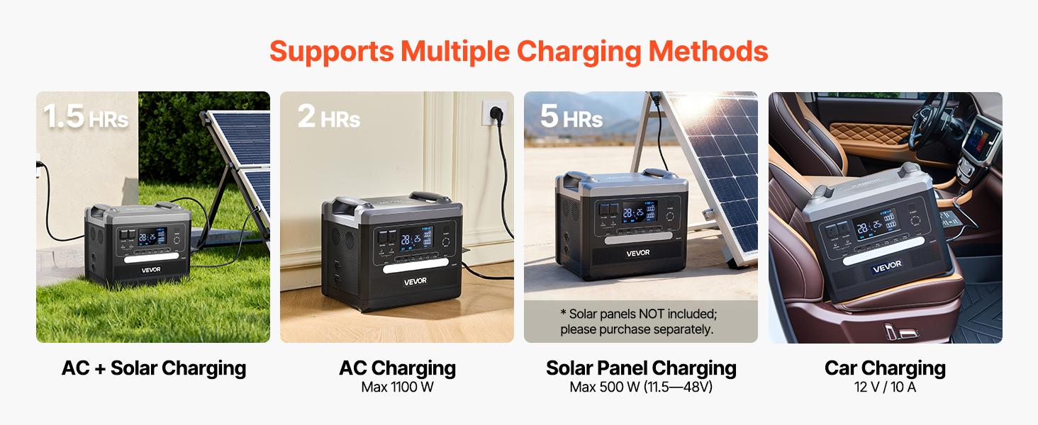 Podporuje nabíjanie striedavým prúdom, solárnou energiou a z auta, čím vám poskytuje viacero flexibilných spôsobov, ako mať elektráreň pripravenú kdekoľvek sa nachádzate. (Solárny panel NIE je súčasťou balenia)