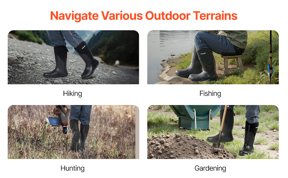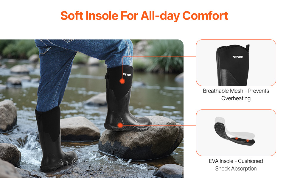 Gumené čižmy sú vyrobené z vysokokvalitnej gumy, ktorá ponúka vynikajúcu odolnosť voči mokrým podmienkam a priedušnosť, vďaka čomu vás udrží v suchu a pohodlí počas outdoorových aktivít. Stielka EVA poskytuje pohodlné nosenie, zatiaľ čo ľahká konštrukcia vám umožní ľahko riešiť rôzne situácie.