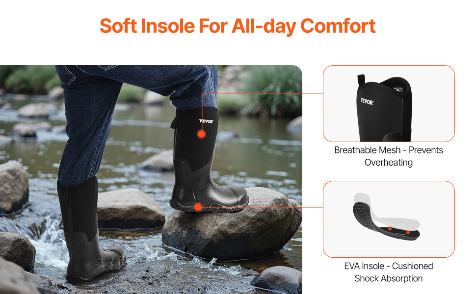 Gumené čižmy sú vyrobené z vysokokvalitnej gumy, ktorá ponúka vynikajúcu odolnosť voči mokrým podmienkam a priedušnosť, vďaka čomu vás udrží v suchu a pohodlí počas outdoorových aktivít. Stielka EVA poskytuje pohodlné nosenie, zatiaľ čo ľahká konštrukcia vám umožní ľahko riešiť rôzne situácie.