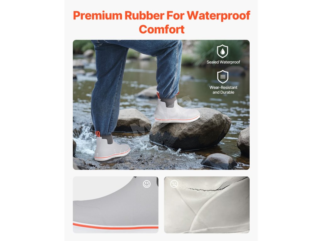 Gumené čižmy sú vyrobené z vysokokvalitnej gumy, ktorá ponúka vynikajúcu odolnosť voči mokrým podmienkam a priedušnosť, vďaka čomu vás udrží v suchu a pohodlí počas outdoorových aktivít. Stielka EVA poskytuje pohodlné nosenie, zatiaľ čo ľahká konštrukcia vám umožní ľahko riešiť rôzne situácie.