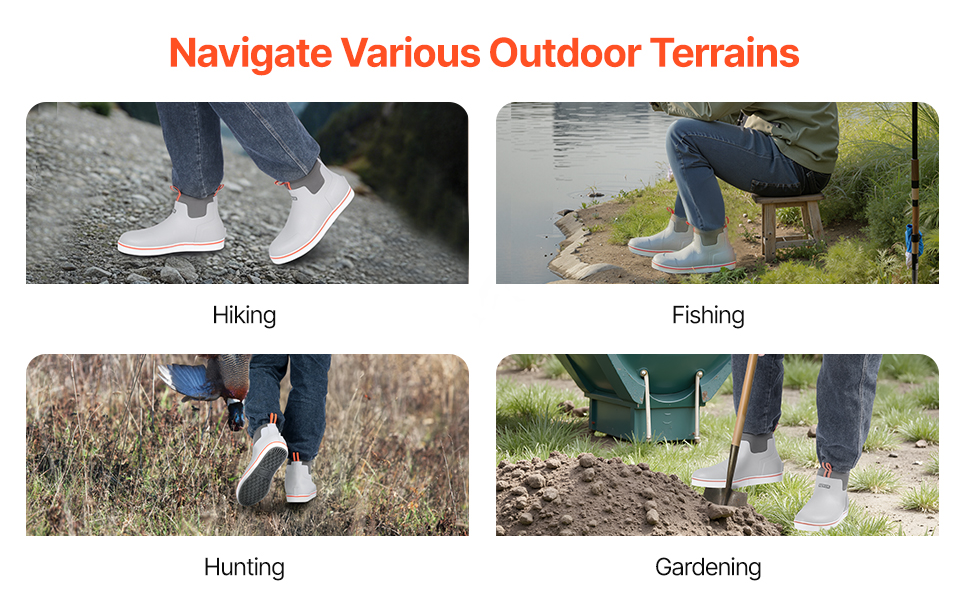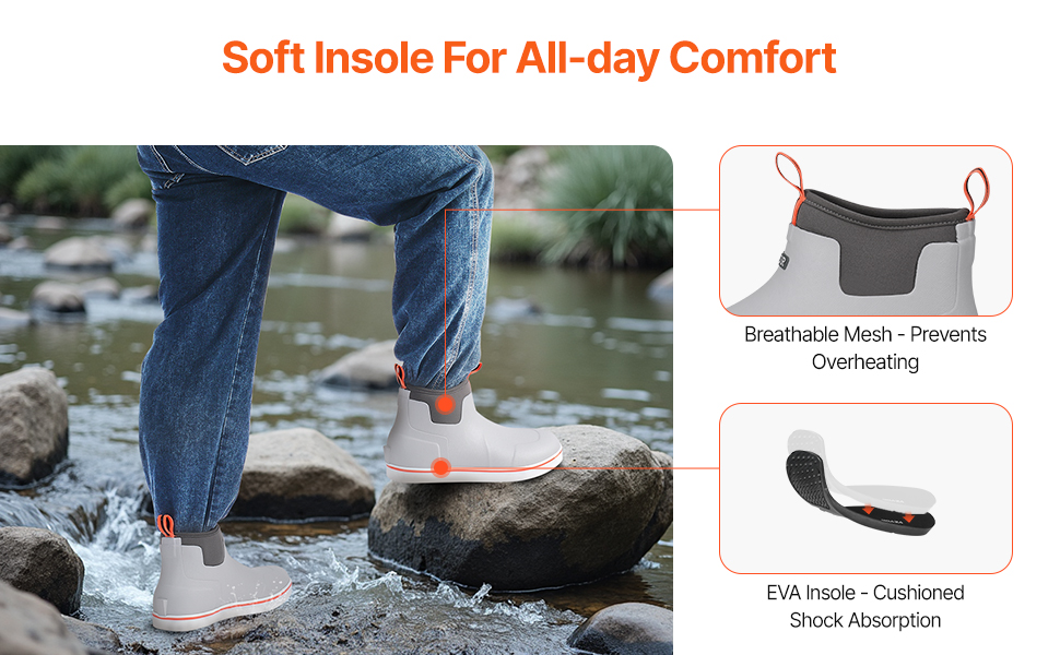Gumené čižmy sú vyrobené z vysokokvalitnej gumy, ktorá ponúka vynikajúcu odolnosť voči mokrým podmienkam a priedušnosť, vďaka čomu vás udrží v suchu a pohodlí počas outdoorových aktivít. Stielka EVA poskytuje pohodlné nosenie, zatiaľ čo ľahká konštrukcia vám umožní ľahko riešiť rôzne situácie.