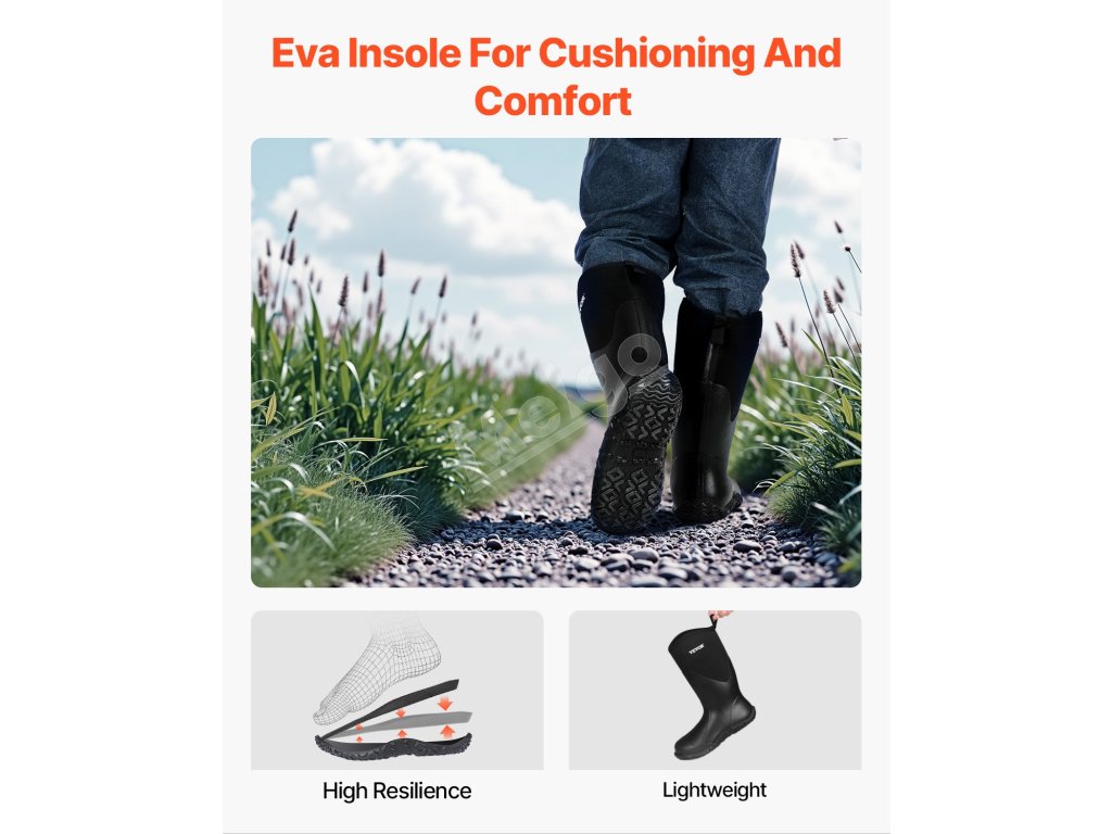 Gumené čižmy sú vyrobené z vysokokvalitnej gumy, ktorá ponúka vynikajúcu odolnosť voči mokrým podmienkam a priedušnosť, vďaka čomu vás udrží v suchu a pohodlí počas outdoorových aktivít. Stielka EVA poskytuje pohodlné nosenie, zatiaľ čo ľahká konštrukcia vám umožní ľahko riešiť rôzne situácie.