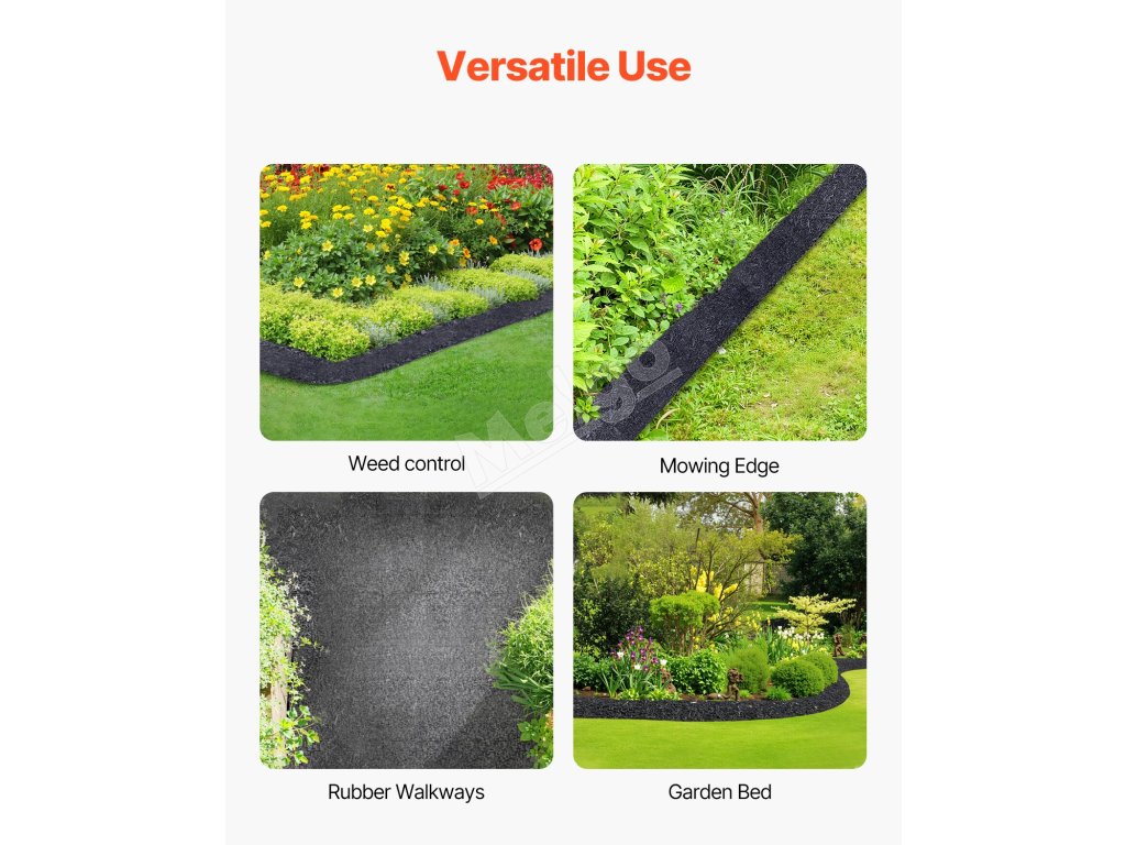 Táto gumová mulčovacia rohož vyrobená z gumy zabraňuje rastu buriny, umožňuje prenikanie vody a živín a udržiava pôdu kyprú. Okrem toho rozdeľuje kvetinové záhony a trávniky, zlepšuje estetiku a zabraňuje vzniku blata počas daždivých dní. Ľahko sa kladie, strihá a skladuje. Ideálna pre záhrady, sady a detské ihriská.