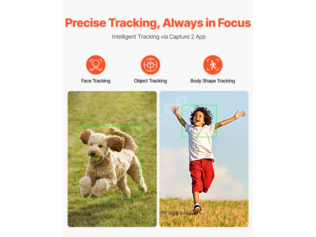 Vďaka inteligentnému sledovaniu a ovládaniu gestami môžete ľahko zamerať objekt alebo prepínať režimy prostredníctvom aplikácie Capture2 APP. Batéria s kapacitou 2600 mAh poskytuje 7-9 hodín prevádzky po 3-4 hodinách nabíjania. Vďaka kompaktnému dizajnu je ideálny na portrétne zábery, rozsiahle krajinky, vlogy alebo živé prenosy.