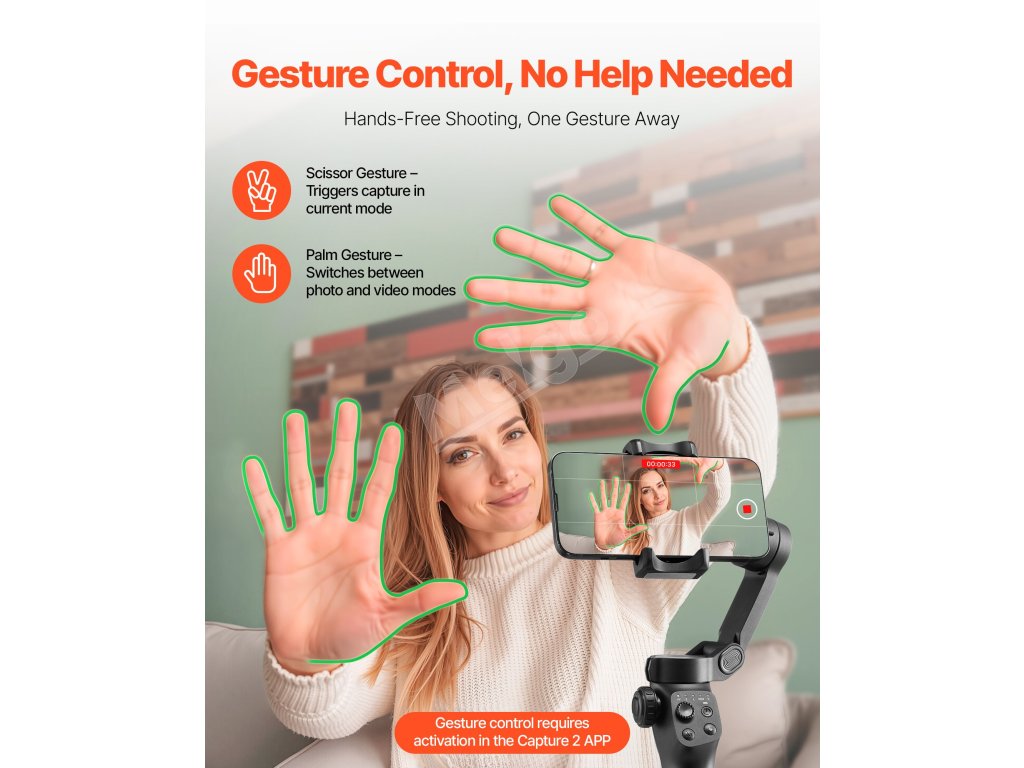 Vstavané tlačidlá a inteligentné ovládanie gestami vám dávajú moc do rúk - doslova. Prepínajte režimy alebo snímajte fotografie jednoduchým mávnutím. Žiadne ťukanie na obrazovku, žiadne šmátranie - len plynulé, intuitívne ovládanie na jednoduché snímanie s naším 3-osovým gimbalovým stabilizátorom pre smartfón.